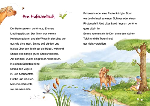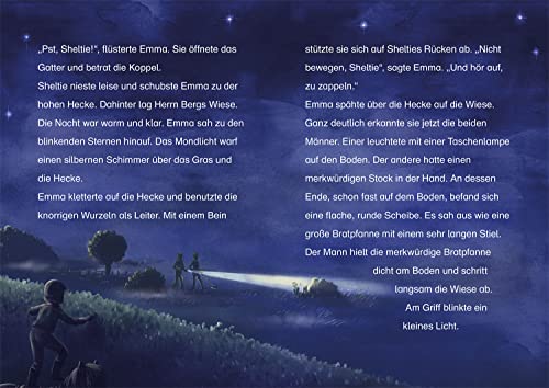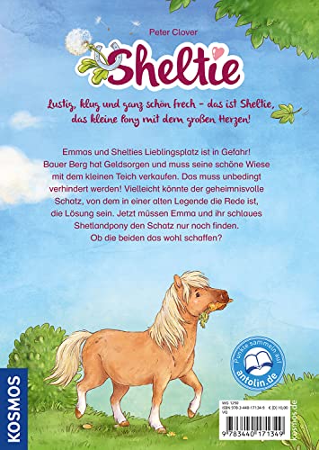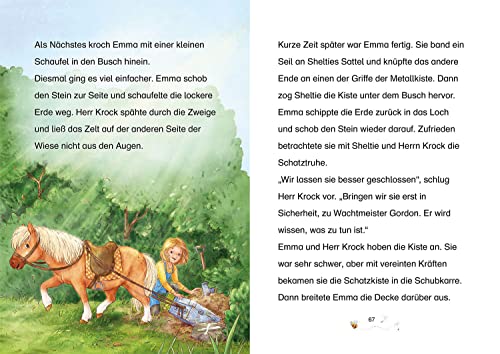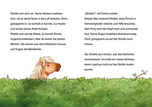Lustige Pony-Abenteuer – viele bunte Bilder – einfach zu lesen! Zum Vorlesen und Lesen üben ab 7 Jahren. Lustig, klug und ganz schön frech – so ist Emmas Pony Sheltie. Gemeinsam erleben die beiden aufregende Abenteuer und haben eine Menge Spass! Oh nein: Bauer Berg muss seine Wiese verkaufen! Dann können Sheltie und Emma dort nicht mehr zum Ausreiten hin. Doch zum Glück findet Sheltie die Lösung in Form einer alten Schatzkarte. Es wäre doch gelacht, wenn Emma und ihr schlaues Pony den Schatz nicht finden und so den Verkauf der Wiese verhindern könnten.