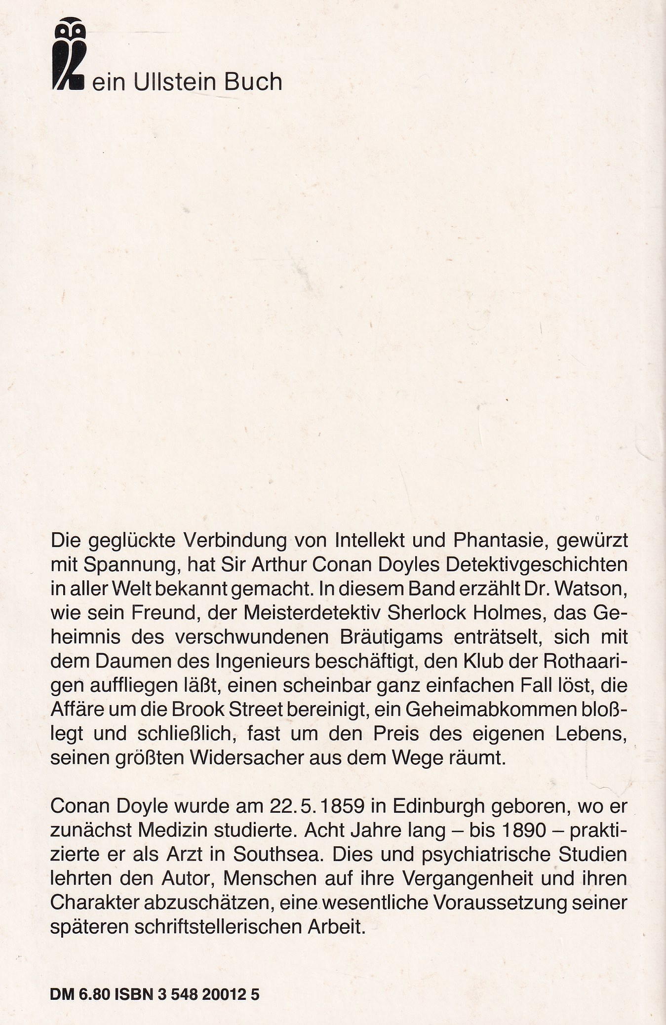 Die geglückte Verbindung von Intellekt und Phantasie, gewürzt mit Spannung, hat Sir Arthur Conan Doyles Detektivgeschichten in aller Welt bekannt gemacht. In diesem Band erzählt Dr. Watson, wie sein Freund, der Meisterdetektiv Sherlock Holmes, das Geheimnis des verschwundenen Bräutigams enträtselt, sich mit dem Daumen des Ingenieurs beschäftigt, den Klub der Rothaarigen auffliegen lässt, einen scheinbar ganz einfachen Fall löst, die Affäre um die Brook Street bereinigt, ein Geheimabkommen blosslegt und schliesslich, fast um den Preis des eigenen Lebens, seinen grössten Widersacher aus dem Wege räumt.