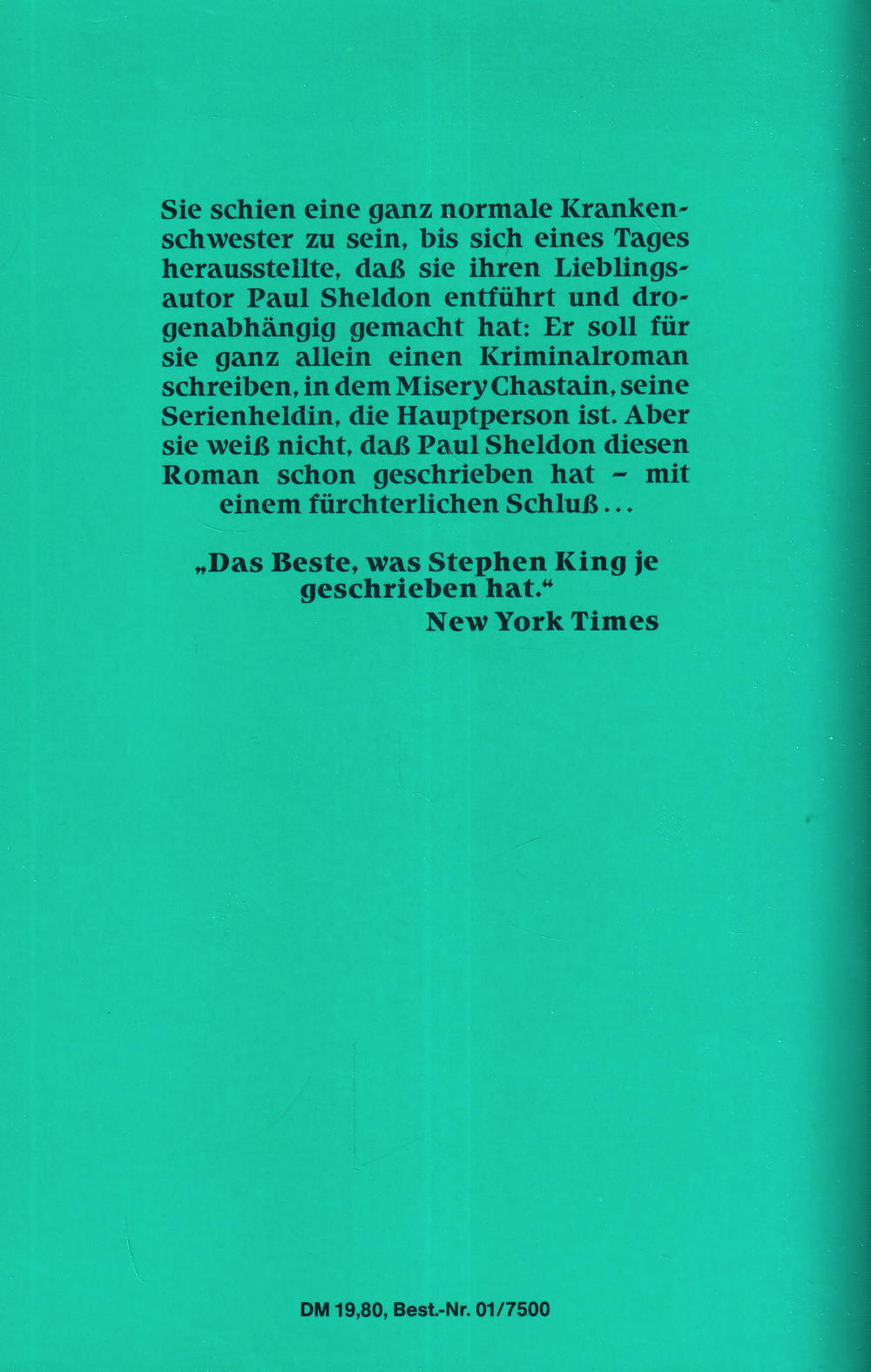 Sie schien eine ganz normale Krankenschwester zu sein, bis sich eines Tages herausstellte, dass sie ihren Lieblingsautor Paul Sheldon entführt und drogenabhängig gemacht hat: Er soll für sie ganz allein einen Kriminalroman schreiben, in dem Misery Chastain, seine Serienheldin, die Hauptperson ist. Aber sie weiss nicht, dass Paul Sheldon diesen mit Roman schon geschrieben hat einem fürchterlichen Schluss...