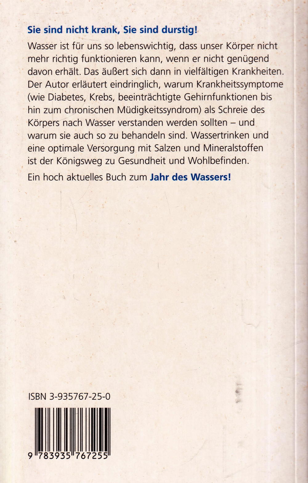 'Sie sind nicht krank, Sie sind durstig!' Das meint Dr. Batmanghelidj wörtlich. Wassertrinken ist so wichtig, dass unser Körper nicht mehr richtig funktionieren kann, wenn er nicht genügend davon erhält. Und das äußert sich dann in vielfältigen Krankheiten. Hier erläutert Dr. Batmanghelidj eindringlich, warum Krankheitssymptome (wie Diabetes, Krebs, beeinträchtigte Gehirnfunktionen bis hin zum chronischen Müdigkeitssyndrom) als Schreie des Körpers nach Wasser verstanden werden sollen und auch so zu behandeln sind. Wassertrinken und eine optimale Versorgung mit Salzen und Mineralstoffen ist der Königsweg zu Gesundheit und Wohlbefinden.