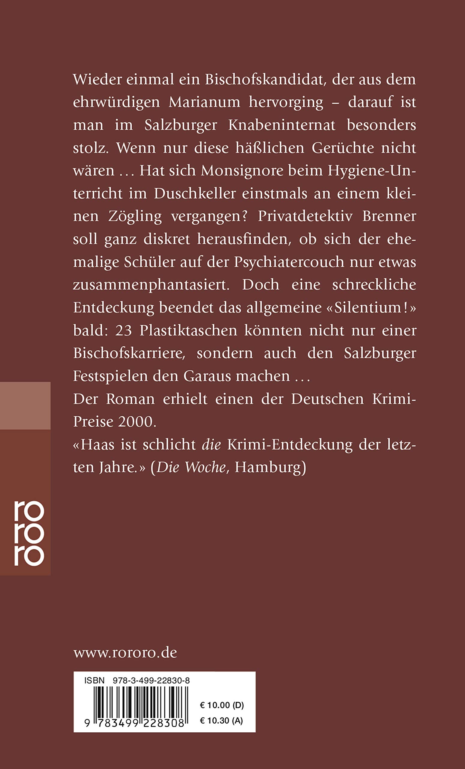 "Wolf Haas hat tintenschwarzen Humor und jenen Blick für die Abgründe der Spezies Mensch, wie sie nur in der Alpenrepublik sich auftun, weil da die Brutalität besonders hartnäckig in der Gemütlichkeit nistet. "Silentium!" führt den lebensklugen Wiener Privatdetektiv Brenner in ein Salzburger Knabeninternat, wo einst im Duschkeller befriedigte und inzwischen vertuschte Lust einen ehrwürdigen Bischofskandidaten um das ersehnte hohe Amt zu bringen droht. 23 Plastiktaschen mit zerstückelten Leichenteilen gefährden gar den Ruf der Festspielstadt." (WAZ)