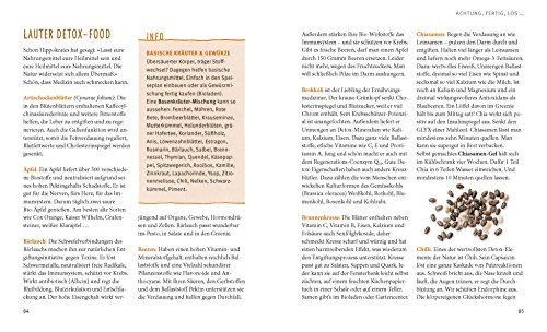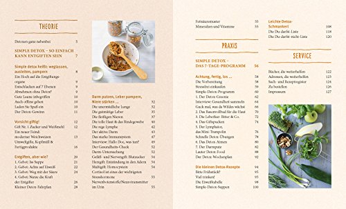 Was heisst Simple Detox? Man lässt alles weg, was dem Körper nicht gut tut, wie Zucker, Weissmehl, gehärtete Fette, Hormone, chemische Zusatzstoffe. Und gibt dem Körper das, was er braucht, um zu entschlacken und zu entgiften - Eiweiss, basische Mineralien, Bitterstoffe, Ballaststoffe. Die ideale Grundlage: Suppen. Kohlsuppe, Brokkoli-Suppe, Lauchsuppe, Ingwersuppe, Wildkräutersuppe...In dem Buch finden Sie sieben magische Suppen, die purer Genuss sind. Für alle, die nicht sieben Tage lang von Suppe leben wollen, gibt es darüber hinaus leichte Detox-Rezepte. Doch es geht nicht nur ums Essen: Sieben irdische Detox-Helfer mit magischer Wirkung werden in dem Buch vorgestellt - vom Basenbad über die Leber-Kur bis zum L-Glutaminsäure-Darm-Pflaster. Wichtig: Detox soll Spass machen, von morgens bis abends. Nicht stressen. Denn Stress ist das Gift Nr. 1. Und darum fängt man zum Beispiel morgens schon zu brummen an. Macht eine Sing-Brumm-Übung im Bett. Nur fünf Minuten. Detox-Atmen sozusagen.
