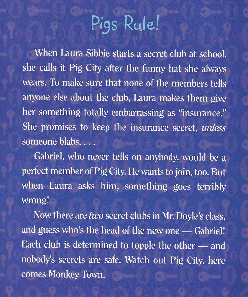 When Laura Sibbie starts a secret club at school, makes the other members them give her something totally embarrassing as "insurance," to make sure they don't tell anyone else about the club. She promises to keep the insurance secret, unless someone blabs. Gabriel, who never tells on anybody, would be a perfect member of Pig City. He wants to join, too. But when Laura asks him, something goes terribly wrong. Now there are two secret clubs in Mr. Doyle's class, and guess who's the head of the new one-Gabriel! Each club is determined to topple the other, and nobody's secrets are safe.