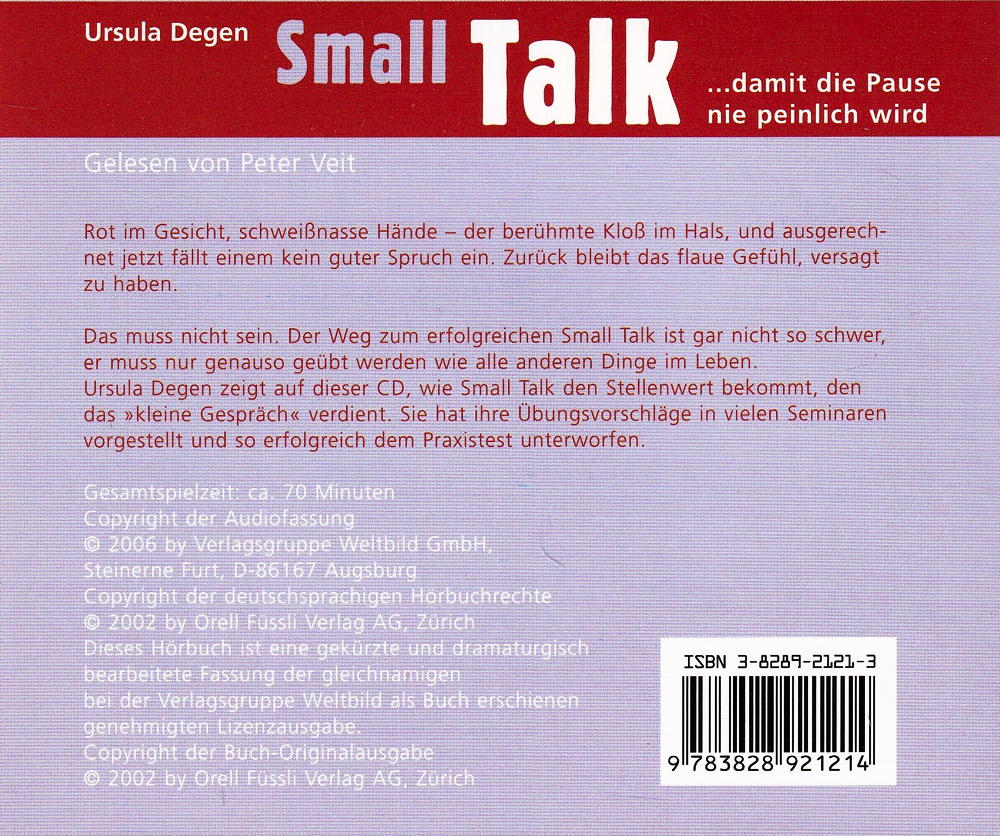 Ursula Degen zeigt auf dieser CD, wie Small Talk den Stellenwert bekommt, den das »kleine Gespräch« verdient. Sie hat ihre Übungsvorschläge in vielen Seminaren vorgestellt und so erfolgreich dem Praxistest unterworfen.