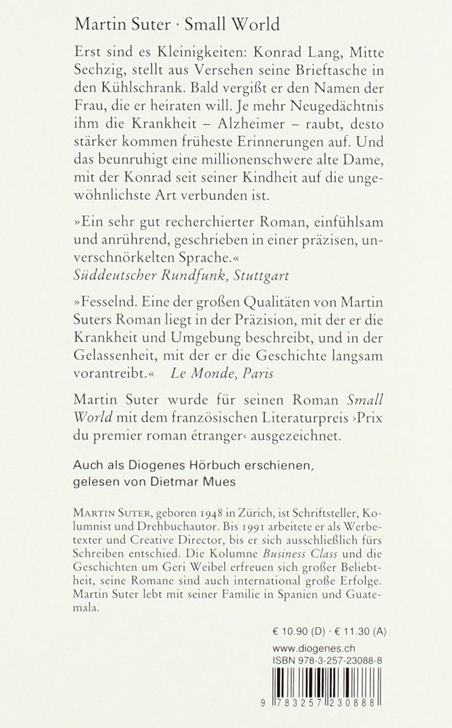 Martin Suter, geboren 1948 in Zürich, lebt mit seiner Frau in Spanien und Guatemala. Er war Werbetexter und erfolgreicher Werber, ein Beruf, den er immer wieder durch andere Schreibtätigkeiten ergänzt oder unterbrochen hat. Unter anderem "GEO"-Reportagen, zahlreiche Drehbücher für Film und Fernsehen. Seit 1991 lebt er als freier Autor, seit 1992 schreibt er die wöchentliche Kolumne "Business Class" in der "Weltwoche".§§Martin Suter ist am 29. März 2004 in Zürich mit der Goldenen Diogenes Eule ausgezeichnet worden.