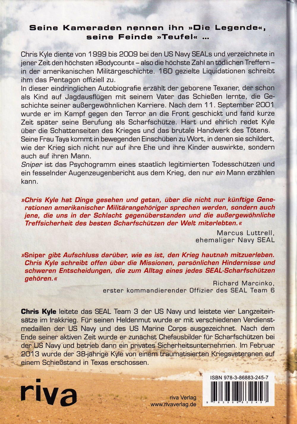 Chris Kyle leitete das Seal Team 3 der US Navy und leistete vier Langzeiteinsätze im Irakkrieg 2003. Für seinen Heldenmut wurde er mit zwei Silver Stars, fünf Bronze Stars und drei Verdienstmedaillen der US Navy und des US Marine Corps ausgezeichnet. Nach dem Ende seiner aktiven Zeit wurde er Chefausbilder für Scharfschützen bei der US Navy und verfasste für diese das erste wegweisende Handbuch.
