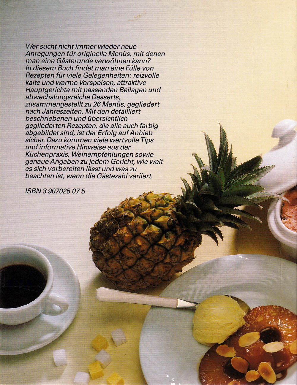 In diesem Buch findet man eine Fülle von Rezepten für viele Gelegenheiten: reizvolle kalte und warme Vorspeisen, attraktive Hauptgerichte mit passenden Beilagen und abwechslungsreiche Desserts, zusammengestellt zu 26 Menüs, gegliedert nach Jahreszeiten. Mit den detailliert beschriebenen und übersichtlich gegliederten Rezepten, die alle auch farbig abgebildet sind, ist der Erfolg auf Anhieb sicher. Dazu kommen viele wertvolle Tips und informative Hinweise aus der Küchenpraxis, Weinempfehlungen sowie genaue Angaben zu jedem Gericht, wie weit es sich vorbereiten lässt und was zu beachten ist, wenn die Gästezahl variiert.