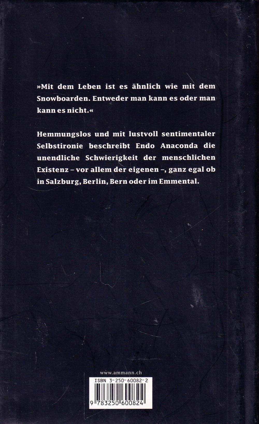 Am liebsten steht er auf seinem kleinen Küchenbalkon inmitten von verdörrten Zimmerpflanzen und raucht. Er schaut hinunter auf die Strasse und beobachtet die kleine Welt im Berner Länggassquartier. Wie bei 38C im Schatten der Teer langsam schmilzt und sich ein Jungpolitiker mit seinem Jeep vor den Mercedes des Stadtpräsidenten schiebt und dann beide im Verkehr steckenbleiben. Wie die Beamten im gegenüberliegenden Bauwrack aus Eternitverschalung Tag für Tag ihre Gummibäume giessen, während ein Securitasmann gerade wieder einmal dabei ist, einen Busszettel unter die Scheibenwischer des geliebten VWPassat zu schieben. Zum Glück gibt es den Taxifahrer Mechmet und die dicke Kioskfrau, bei der Anaconda regelmässig seine Parisiennes holt. Hemmungslos und mit lustvoll sentimentaler Selbstironie beschreibt Endo Anaconda, Texter und Sänger von Stiller Has, die unendliche Schwierigkeit der menschlichen Existenz vor allem der eigenen ganz egal ob in Salzburg, Berlin oder Bern. Seine Kolumnen sind Milieustudien über das Mittelmass, über den Untergrund der Dienstleister, über Leute, die ihr Schicksal bejammern, sich besaufen und dann vom eigenen Hund in den Hintern gebissen werden, sind poetische Aperçus über die elende Dialektik des Rauchens und Trinkens, über ketchupsüchtige Kinder und alle möglichen Schweizer Psychosen. Diese bluesige Comédie humaine ist echt wem sonst passiert es, dass die weggeschnippte Kippe direkt auf der Mütze des vorbeigehenden Securitasmannes landet?