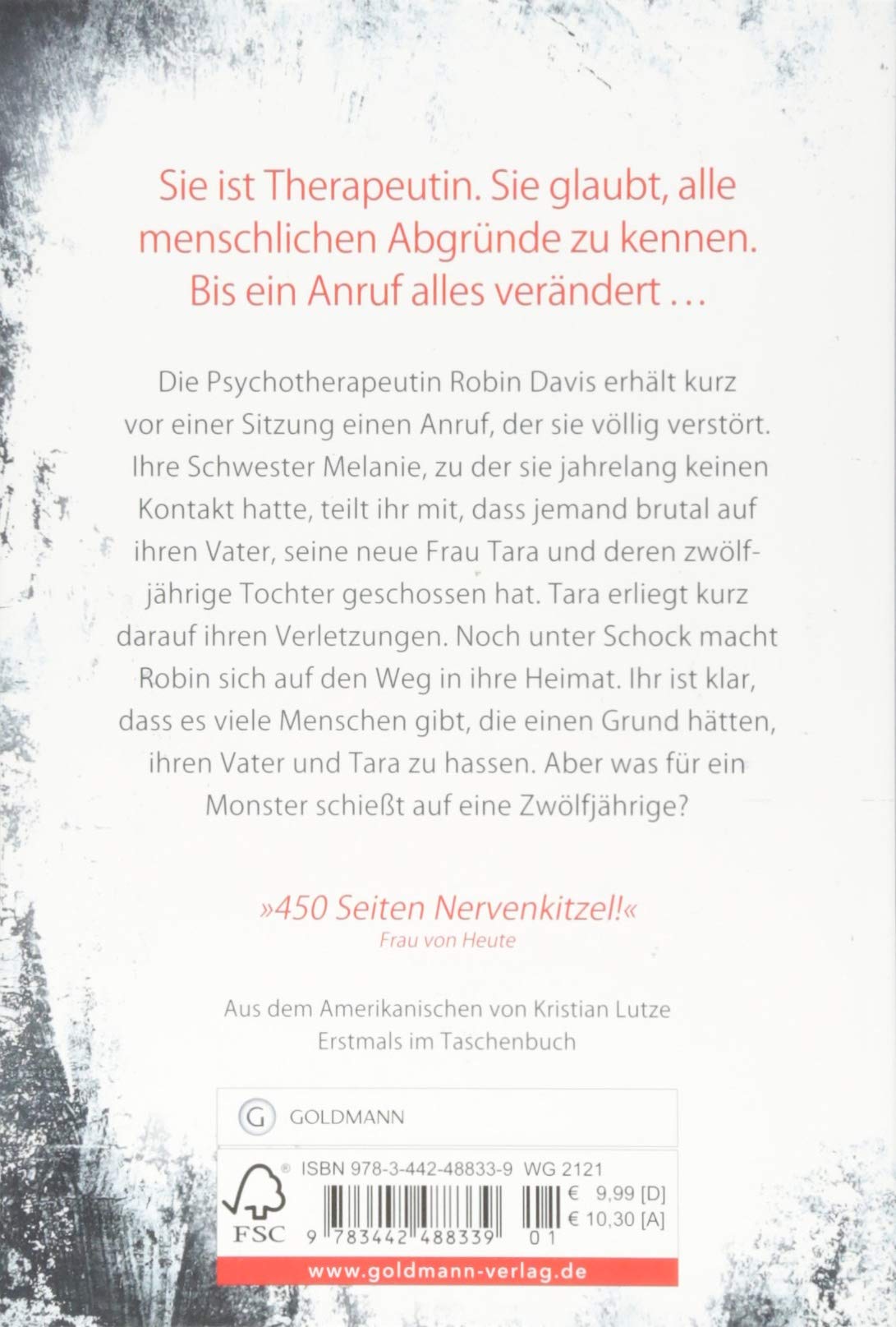 Die Psychotherapeutin Robin Davis erhält kurz vor einer Sitzung einen Anruf, der sie völlig aus der Fassung bringt. Ihre Schwester Melanie, zu der sie jahrelang keinen Kontakt hatte, teilt ihr mit, dass jemand brutal auf ihren Vater, seine neue Frau Tara und deren zwölfjährige Tochter geschossen hat. Tara erliegt kurz darauf ihren Verletzungen. Noch unter Schock macht Robin sich auf den Weg in ihren Heimatort. Ihr ist klar, dass es viele Menschen gibt, die einen Grund hätten, ihren Vater und Tara zu hassen - allen voran ihre eigene Familie. Aber was für ein Monster schießt auf eine Zwölfjährige?