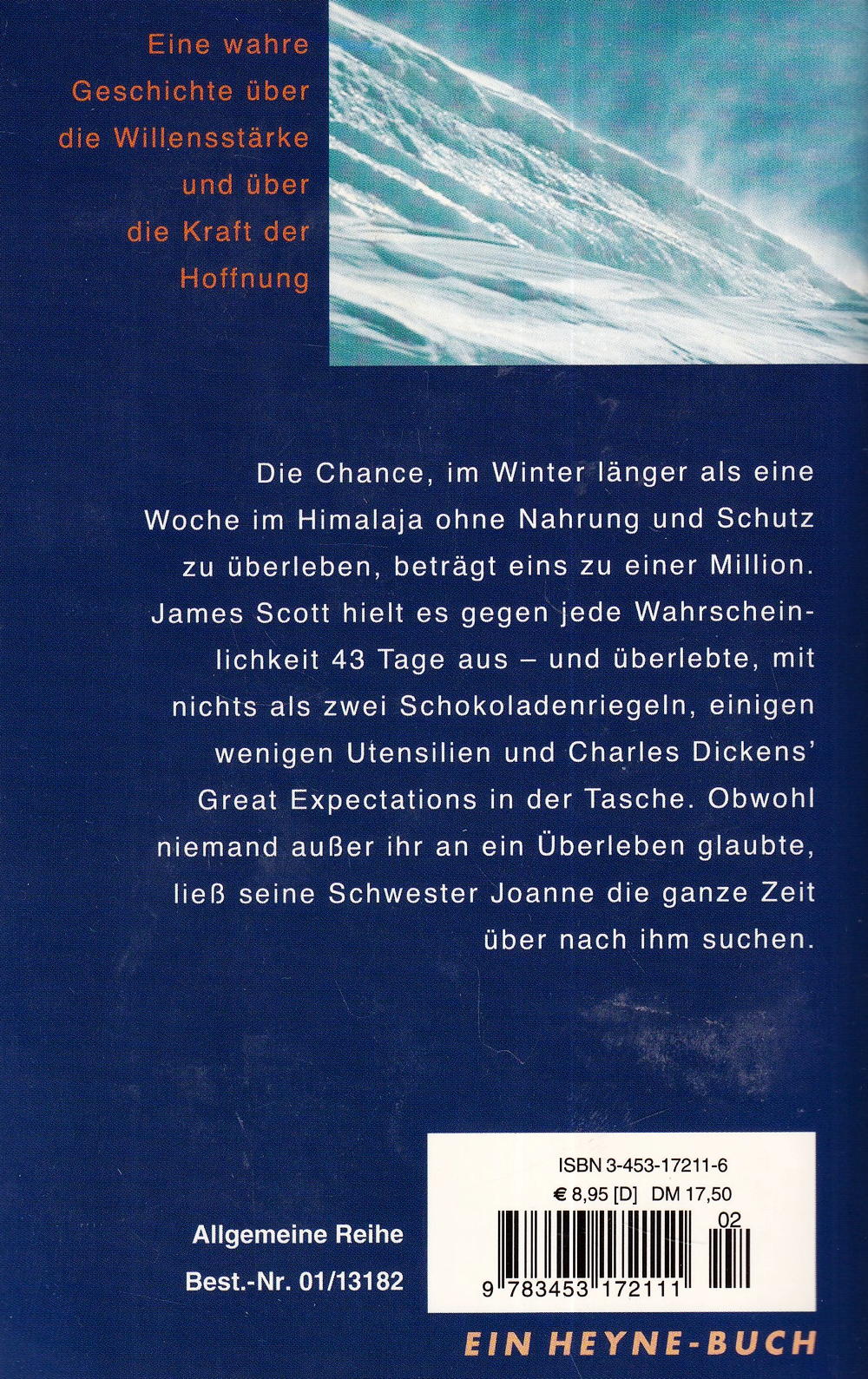 Die Chance, im Winter länger als eine Woche im Himalaja ohne Nahrung und Schutz zu überleben beträgt eins zu einer Million. James Scott hielt es gegen jede Wahrscheinlichkeit 43 Tage aus - und überlebte, mit nichts als zwei Schokoladenriegeln, einigen Untensilien und Charles Dickens 'Great Expectations' in der Tasche. Obwohl niemand ausser ihr an ein Überleben glaubte, liess seine Schwester Joanne die ganze zeit über nach ihm suchen.