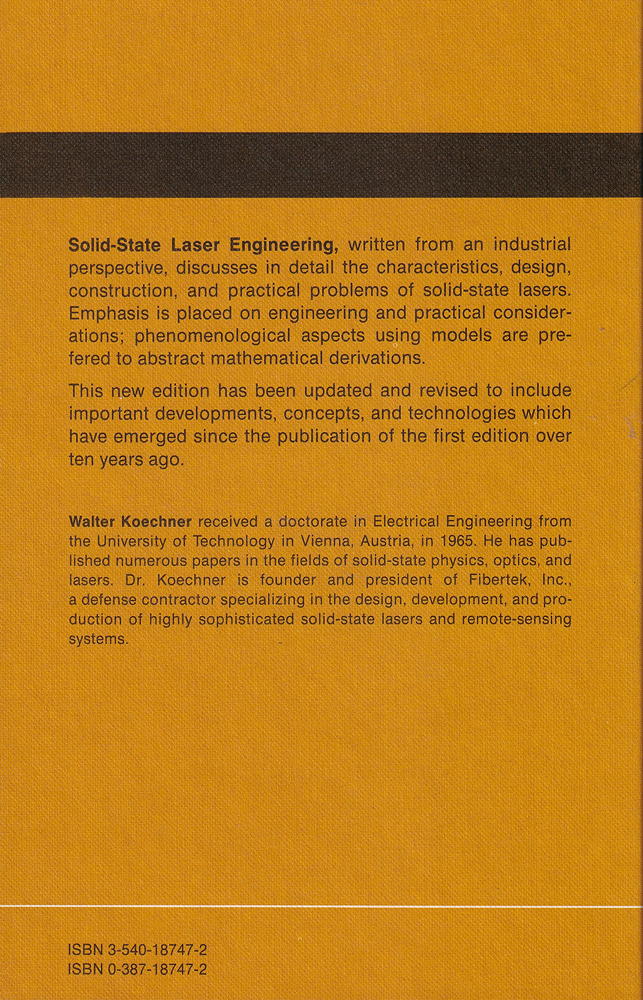Solid-State Laser Engineering is written from an industrial perspective and discusses in detail the characteristics, design, construction and practical problems of solid-state lasers. Emphasis is placed on engineering and practical considerations, with a phenomenological treatment using modelsbeing preferred to abstract mathematical derivations. This new edition has been updated and revised to include important developments, concepts and technologies that have emerged since the publication of the first edition.