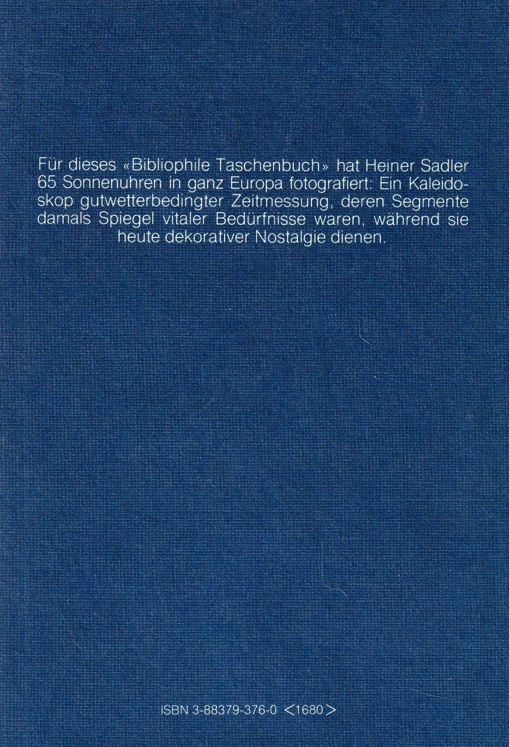 Für dieses «Bibliophile Taschenbuch» hat Heiner Sadler 65 Sonnenuhren in ganz Europa fotografiert: Ein Kaleidoskop gutwetterbedingter Zeitmessung, deren Segmente damals Spiegel vitaler Bedürfnisse waren, während sie heute dekorativer Nostalgie dienen.