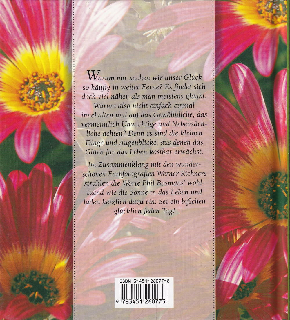 Im Zusammenklang mit den wunderschönen Farbfotografien Werner Richners strahlen die Worte Phil Bosmans' wohltuend wie die Sonne in das Leben und laden herzlich dazu ein: Sei ein bisschen glücklich jeden Tag!
