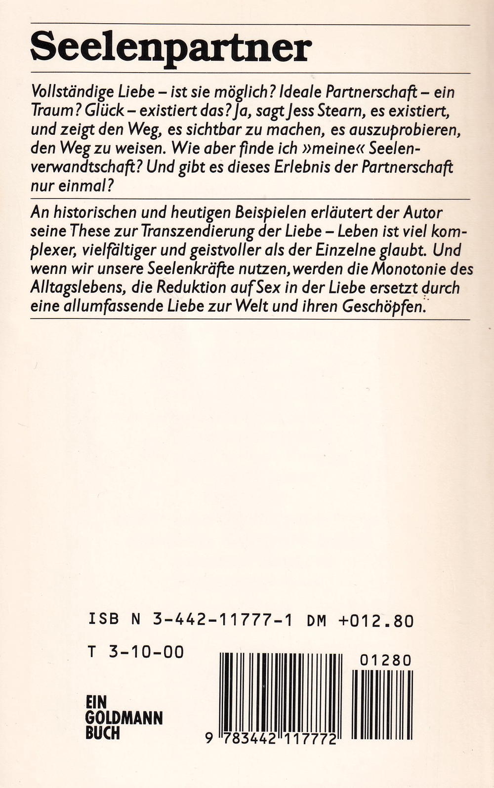 Vollständige Liebe - ist sie möglich? Ideale Partnerschaft- ein Traum? Glück -existiert das? Ja, sagt Jess Stearn, es existiert, und z zur nächsten Seite Sichtbar zu machen, es auszuprobieren, den Weg zu weisen. Wie aber finde ich »meine« Seelenverwandtschaft? Und gibt es dieses Erlebnis der Partnerschaft nur einmal?