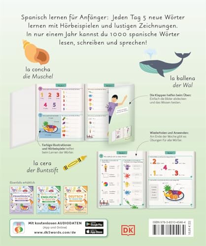 Adiós, langweilige Spanisch-Vokabeltrainer! Mit diesem Spanisch-Wörterbuch für Kinder ab 8 Jahren macht Spanisch lernen richtig Spass – und geht obendrein ganz leicht. Mit kindgerechtem Wortschatz, anschauliche Illustrationen und von Muttersprachler*innen eingesprochene Hörbeispiele über die kostenlose App und auf einer Webseite lernen die Kinder spielerisch 5 Wörter am Tag – und am Ende jeder Woche warten Wiederholungsaufgaben zum Vertiefen. Der kinderleichte Einstieg in die Fremdsprache Spanisch: • 1000 erste Spanisch-Vokabeln: Mit einfachen Übungen, Illustrationen und Audio-Beispiel lernen Kinder spielerisch 5 Wörter pro Tag