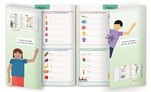 • Clever gestaltet: Mit versteckten Klappen können Kinder testen, wie gut sie sich die neuen Vokabeln gemerkt haben