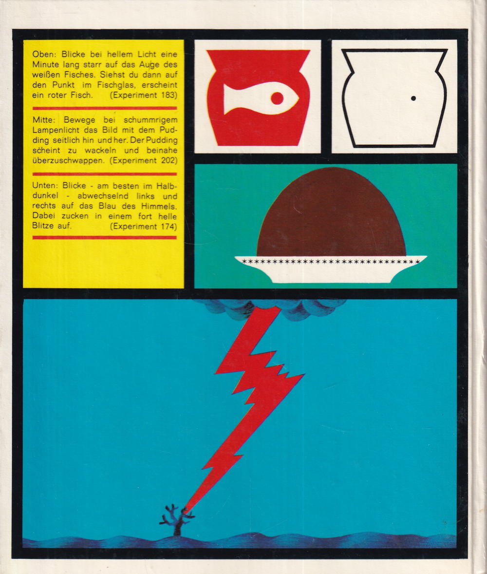 Oben: Blicke bei hellem Licht eine Minute lang starr auf das Auge des weissen Fisches. Siehst du dann auf den Punkt im Fischglas, erscheint ein roter Fisch.