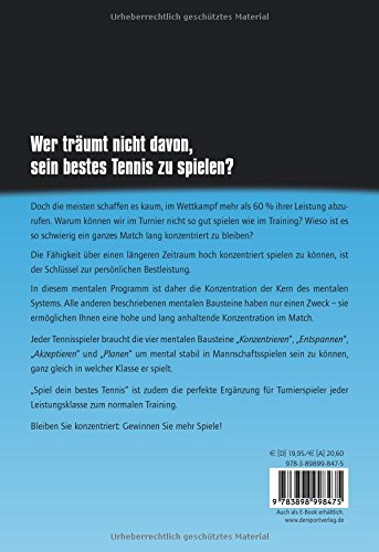 Wer träumt nicht davon, sein bestes Tennis zu spielen? Doch die meisten schaffen es kaum, im Wettkampf mehr als 60 % ihrer Leistung abzurufen. Warum können wir im Turnier nicht so gut spielen wie im Training? Wieso ist es so schwierig ein ganzes Match lang konzentriert zu bleiben? Die Fähigkeit über einen längeren Zeitraum hoch konzentriert spielen zu können, ist der Schlüssel zur persönlichen Bestleistung. In diesem mentalen Programm ist daher die Konzentration der Kern des mentalen Systems. Alle anderen beschriebenen mentalen Bausteine haben nur einen Zweck sie ermöglichen Ihnen eine hohe und lang anhaltende Konzentration im Match. Das mentale Spiel wird zunächst in zwei Zeitabschnitte unterteilt. Das Spiel in den Ballwechseln und das Spiel zwischen den Punkten. Jeder Tennisspieler braucht die vier mentalen Bausteine Konzentrieren, Entspannen, Akzeptieren und Planen um mental stabil in Mannschaftsspielen sein zu können, ganz gleich in welcher Klasse er spielt. Turnierspieler regional wie überregional, brauchen zusätzlich noch zwei Bausteine, wollen sie nicht nur mental stabil, sondern auch mental stark werden. Deswegen werden im vierten Kapitel die mentalen Bausteine Einstimmen und Regenerieren behandelt. Bei Einstimmung geht es um einen konzentrierten Start ins Match. Erfolgreiche Regeneration nach dem Match führt zu einer hohen Konzentration während eines gesamten Turniers. Profispieler müssen darüber hinaus mindestens noch zwei weitere mentale Bausteine entwickeln: Periodisieren und Inspirieren. Auf eine gute Trainings- und Turnierplanung kann ein Profispieler nicht verzichten. Das Periodisieren der sportlichen Aktivitäten und das Finden einer Lebensbalance sind ratsam, wenn man ein ganzes Jahr lang konzentriert und auf hohem Niveau spielen will. Besonders wichtig für Berufstennisspieler ist, von welchem Geist sie sich inspirieren lassen. Mit der Philosophie des unendlichen Spiels wird Ihnen ein Konzept vorgestellt, wie Sie mental spitze werden.