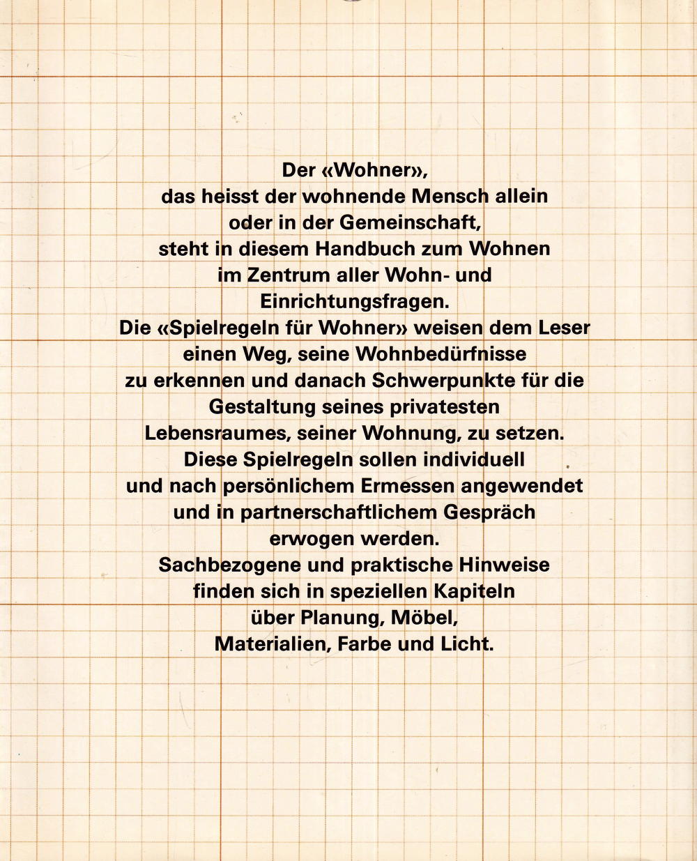 Die «Spielregeln für Wohner» weisen dem Leser einen Weg, seine Wohnbedürfnisse zu erkennen und danach Schwerpunkte für die Gestaltung seines privatesten Lebensraumes, seiner Wohnung, zu setzen.
