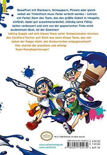Bewaffnet mit Klecksrollern, Schwappern, Pinseln, Blubberwerfern oder am besten gleich selbst als Tintenfisch, muss Farbe verteilt werden – und zwar extrem viel Farbe! Denn das Team, das das grösste Gebiet in der Stadt Inkopolis einfärbt, ist das Gewinnerteam! Doch dabei muss man gut zusammenarbeiten, ständig seine Fähigkeiten verbessern und darf sich nicht von der gegnerischen Tinte übermalen lassen. Inkling Goggle und sein blaues Team voller Schwachmaten mischen das CoroCoro-Turnier auf! Doch was kann dieses Team, das voll neben der Kappe steht, den Konkurrenten entgegensetzen? Hier startet der grandiose und witzige Team-Kampfspielmanga!!Der ideale Einstieg für Kinder in die Manga-Welt und auch ein grosser Spass für alle Gamer und Junggebliebenen!