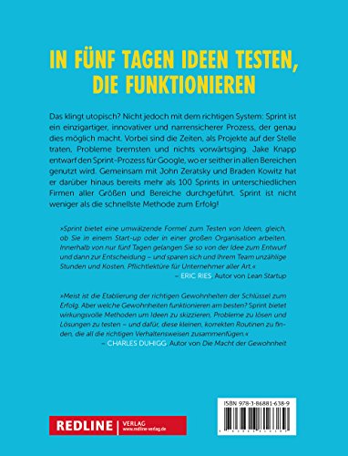 Unternehmer, Gründer und Teams stehen täglich vor der Herausforderung: Womit soll man zuerst anfangen, worauf sich am meisten fokussieren? Und wie viele Diskussionen und Meetings sind nötig, bevor man ganz sicher die garantiert richtige Lösung hat? Die Folge ist, dass allzu oft das Projekt auf der Stelle tritt und man überhaupt nicht vorwärtskommt. Dafür gibt es eine geniale Lösung: Sprint. Die ist ein einzigartiger, innovativer und narrensicherer Prozess, mit dem sich die härtesten Probleme in nur fünf Tagen lösen lassen – von Montag bis Freitag. Der Entwickler Jake Knapp entwarf diesen Prozess bei und für Google, wo er seither in allen Bereichen genutzt wird. Zusammen mit John Zeratsky und Braden Kowitz hat er darüber hinaus bereits mehr als 100 Sprints in Firmen aus unterschiedlichen Bereichen durchgeführt. Der Sprint-Prozess bietet praktische Hilfe für Unternehmen aller Grössen, vom kleinen Start-up bis hin zum Fortune-100-Unternehmen. Die Methode ist auch für alle anderen bewährt, die vor einem grossen Problem stehen, schnell eine Idee testen oder einfach eine Möglichkeit schnell ergreifen wollen.