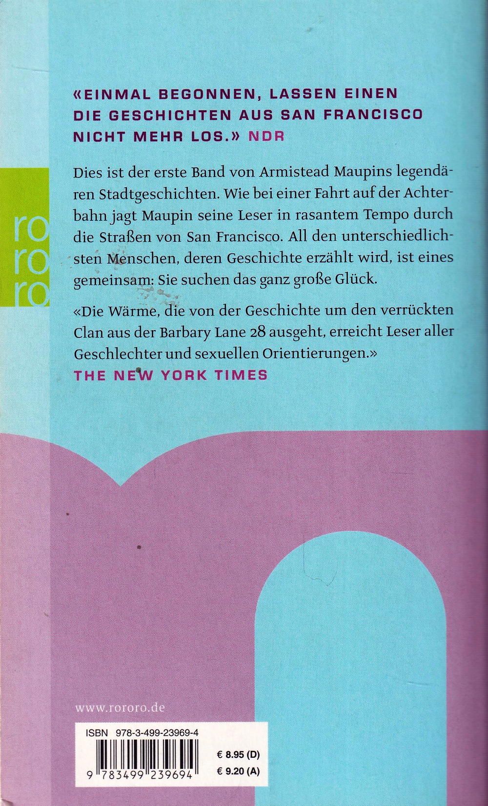 Dies ist der erste Band von Armistead Maupins legendären Stadtgeschichten. Wie bei einer Fahrt auf der Achterbahn jagt Maupin seine Leser in rasantem Tempo durch die Strassen von San Francisco. All den unterschiedlichsten Menschen, deren Geschichte erzählt wird, ist eines gemeinsam: Sie suchen das ganz grosse Glück.