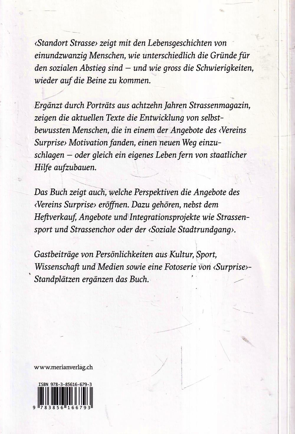 ‹Standort Strasse› porträtiert zwanzig Personen und zeigt eindrücklich, wie unterschiedlich die Gründe für den sozialen Abstieg sind, und wie gross die Schwierigkeiten, wieder auf die Beine zu kommen. Die aktuellen Porträts werden ergänzt durch Portraits derselben Person, die in den letzten 18 Jahren in den Surprise-Heften erschienen sind. Das Buch liefert keine beschönigten Erfolgsgeschichten, sondern stolze Menschen, die trotz sozialer Not alternative Lebensentwürfe abseits staatlicher Hilfe fanden. Das Buch zeigt auch, welche Perspektiven die Angebote des Vereins Surprise eröffnen. Dazu gehören nebst dem Heftverkauf auch verschiedene Aktivitäten und Integrationsprojekte wie Strassensport, Strassenchor oder der Soziale Stadtrundgang. Texte von Persönlichkeiten aus Sport, Kultur, Politik und Wirtschaft und eine Fotoserie von Surprise Standplätzen ergänzen das Buch.