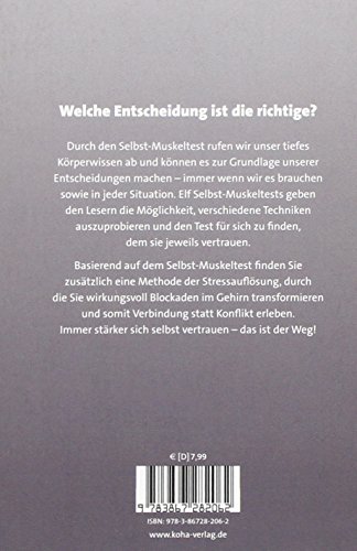 Welche Entscheidung ist die richtige? Durch den Selbst-Muskeltest rufen wir unser tiefes Körperwissen ab und können es zur Grundlage unserer Entscheidungen machen immer wenn wir es brauchen sowie in jeder Situation. Elf Selbst-Muskeltests geben den Lesern die Möglichkeit, verschiedene Techniken auszuprobieren und den Test für sich zu finden, dem sie jeweils vertrauen. Basierend auf dem Selbst-Muskeltest finden Sie zusätzlich eine Methode der Stressauflösung, durch die Sie wirkungsvoll Blockaden im Gehirn transformieren und somit Verbindung statt Konflikt erleben. Immer stärker sich selbst vertrauen das ist der Weg!