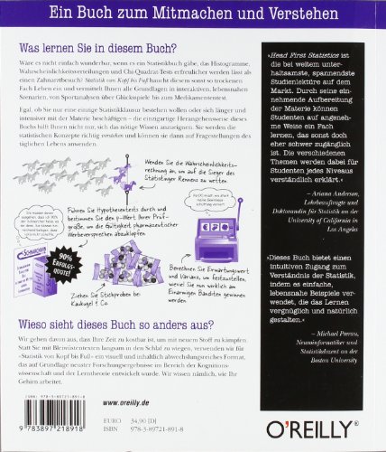 Wäre es nicht einfach wunderbar, wenn es ein Statistikbuch gäbe, das Histogramme, Wahrscheinlichkeitsverteilungen und Chi-Quadrat-Tests erfreulicher werden lässt als einen Zahnarztbesuch? Statistik von Kopf bis Fuss haucht diesem sonst so trockenen Fach Leben ein und vermittelt Ihnen alle Grundlagen in interaktiven, lebensnahen Szenarien, von Sportanalysen über Glücksspiele bis zum Medikamententest. Egal, ob Sie nur eine einzige Statistikklausur bestehen wollen oder sich länger und intensiver mit der Materie beschäftigen - dieses einzigartige Buchs hilft Ihnen nicht nur, sich das nötige Wissen anzueignen. Sie werden die statistischen Konzepte richtig verstehen und können Sie dann auf Fragen des täglichen Lebens anwenden.