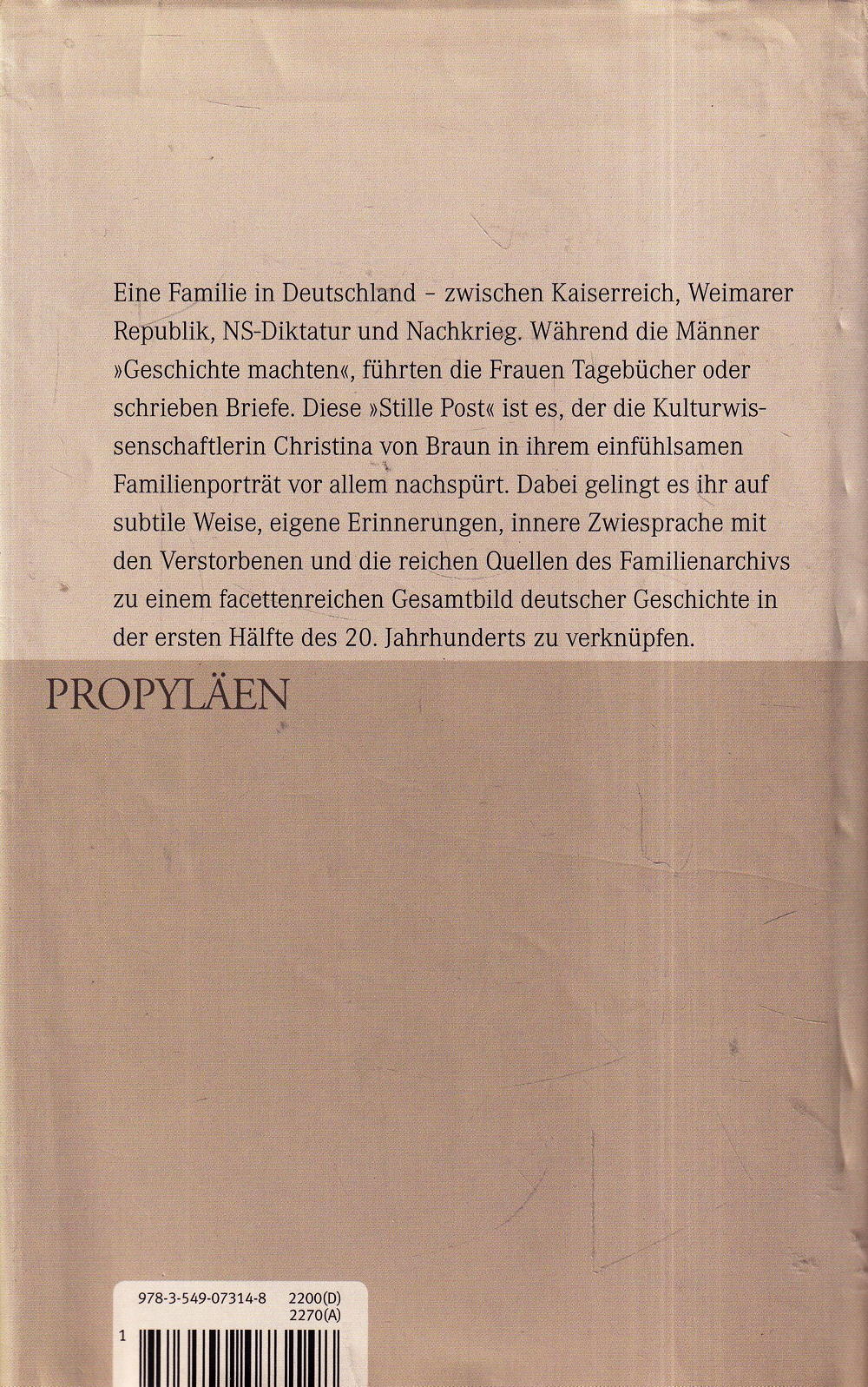 'Familiengeschichten haben offene und verborgene Gesichter, sie werden auf laute und auf verschwiegene Weise von Generation zu Generation weitergegeben. Die Kulturwissenschaftlerin Christina von Braun versucht die Botschaften zu entschlüsseln, die ihr vor allem durch die Frauen der Familie nach dem Muster der "Stillen Post" übermittelt wurden. Dabei verknüpft sie auf subtile, einfühlsame Weise eigene Erinnerungen, innere Zwiesprache mit den Verstorbenen und die reichen Quellen des Familienarchivs - Briefe, Tagebücher, unveröffentlichte Memoiren.