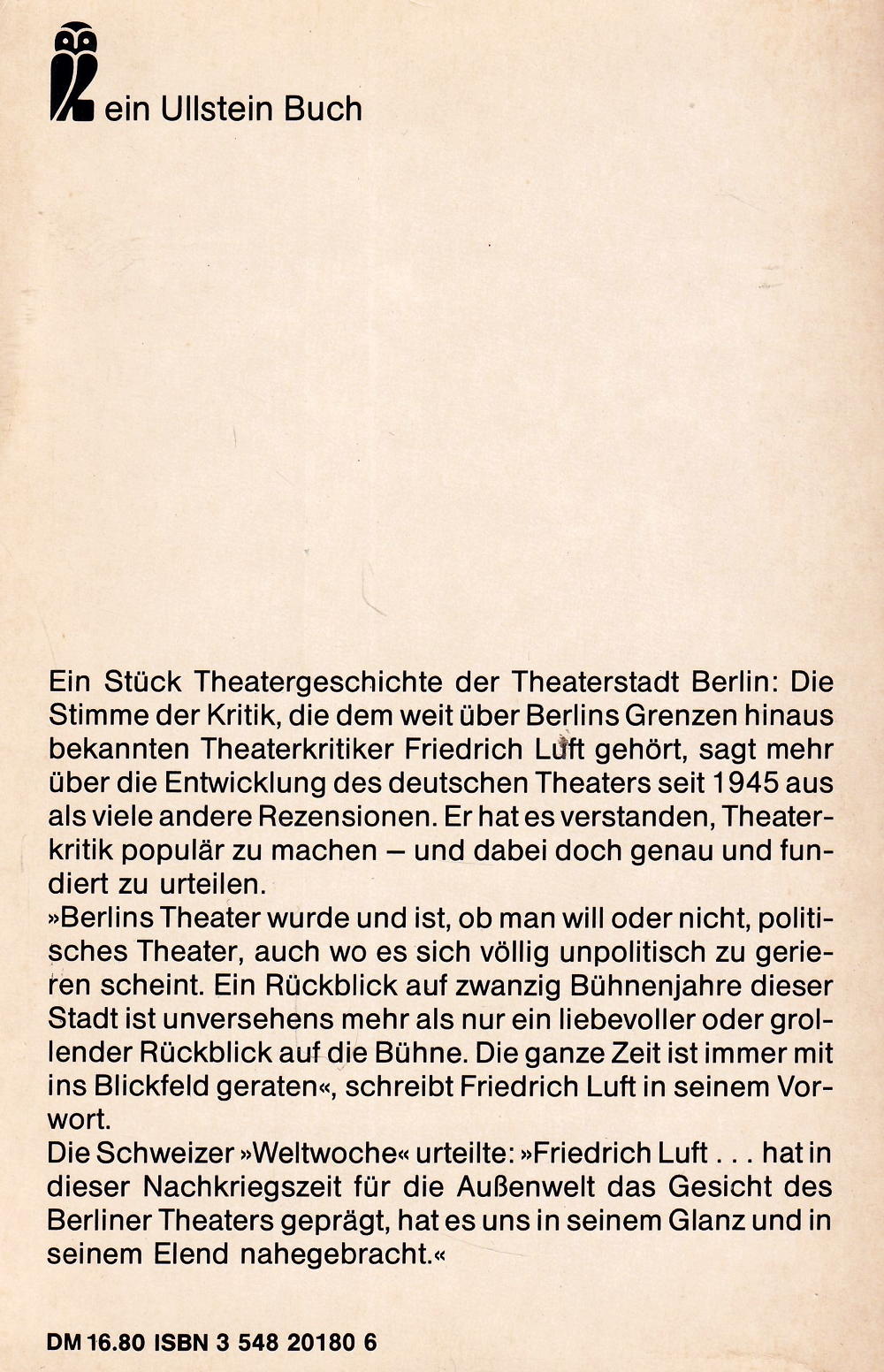 »Berlins Theater wurde und ist, ob man will oder nicht, politisches Theater, auch wo es sich völlig unpolitisch zu gerieren scheint. Ein Rückblick auf zwanzig Bühnenjahre dieser Stadt ist unversehens mehr als nur ein liebevoller oder grollender Rückblick auf die Bühne. Die ganze Zeit ist immer mit ins Blickfeld geraten«, schreibt Friedrich Luft in seinem Vorwort.
