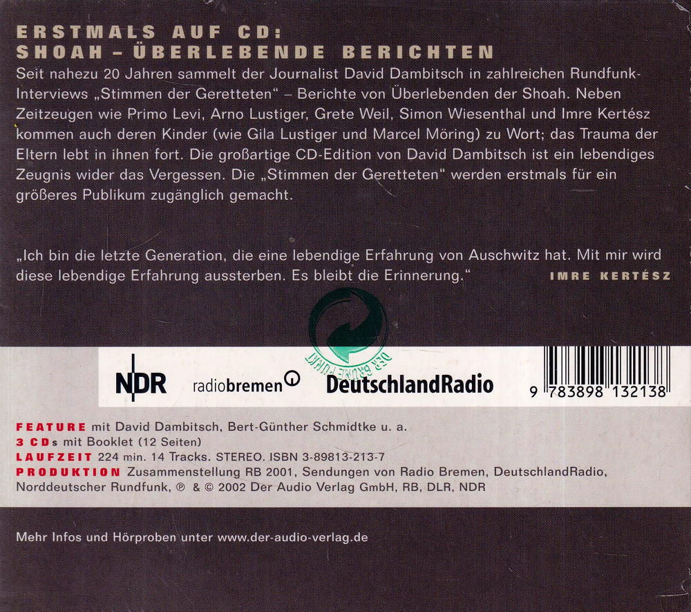 Seit nahezu 20 Jahren sammelt der Journalist David Dambitsch in zahlreichen Rundfunk-Interviews "Stimmen der Geretteten" - Berichte von Überlebenden der Shoah. Neben Zeitzeugen wie Primo Levi, Arno Lustiger, Grete Weil, Simon Wiesenthal und Imre Kertész kommen auch deren Kinder zu Wort; das Trauma der Eltern lebt in ihnen fort. Die grossartige CD-Edition von David Dambitsch ist ein lebendiges Zeugnis wider das Vergessen. Die "Stimmen der Geretteten" werden erstmals für ein grösseres Publikum hörbar.