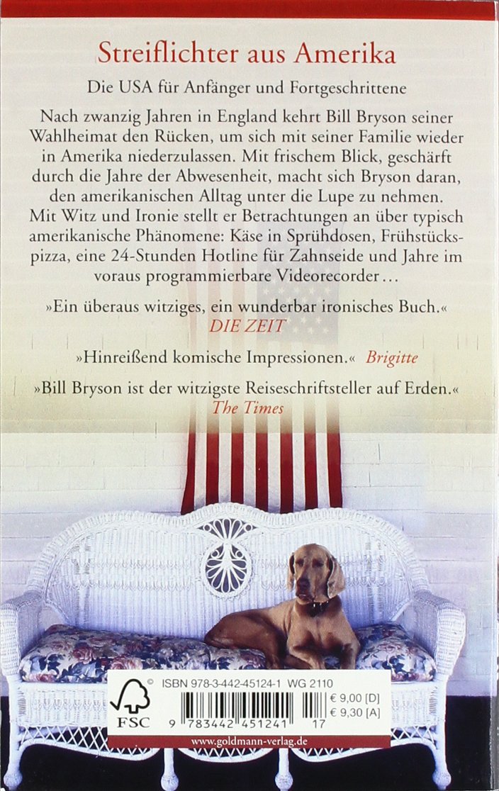 Nach zwanzig Jahren in England findet Bill Bryson, dass es nun genug sei. Er kehrt seiner Wahlheimat den Rücken, um sich mit seiner Familie wieder in Amerika zu etablieren. Mit frischem Blick, geschärft durch die Jahre der Abwesenheit, macht sich Bryson daran, den amerikanischen Alltag unter die Lupe zu nehmen. Sarkastisch und beissend, ironisch und witzig und dabei immer auch höchst informativ stellt er Betrachtungen an über typisch amerikanische Phänomene: Die Präsidentenwahl, Risiken und Nebenwirkungen überhöhten TV-Genusses oder gewisse kulinarische Traditionen. Aber auch die nostalgische Beschwörung verblasster Mythen – etwa Motels oder Highways – kommt dabei nicht zu kurz. Während es so manchen Irrwitz zu beklagen gibt, stehen dem amerikanischen Bürger doch eine Vielzahl komfortabler Nebensächlichkeiten zur Verfügung, die das Leben versüssen: Eine 24-Stunden-Hotline für Zahnseide, Jahre im voraus programmierbare Video-Recorder oder die gehobene Computervariante mit dem praktischen Getränketablett, das nur der unkundige als CD-Einzug interpretiert ...