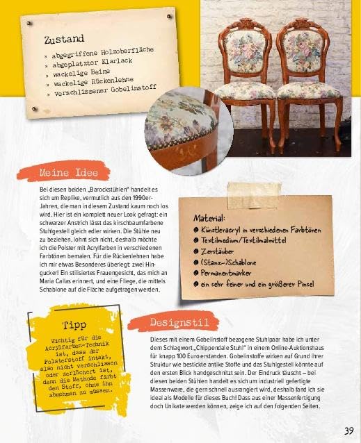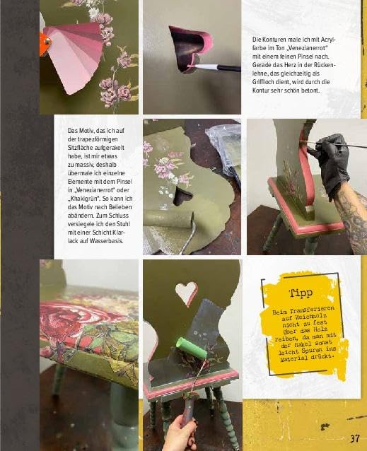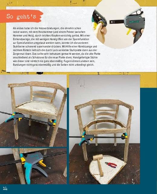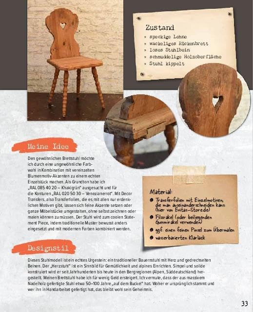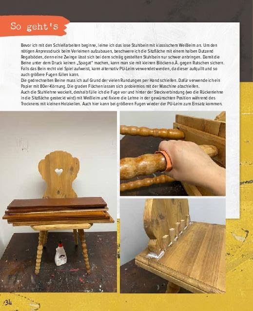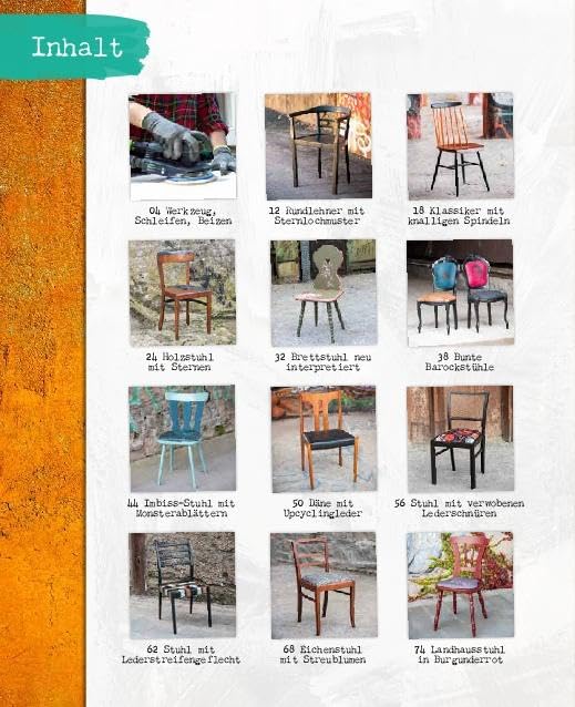 Omas heissgeliebter Bauernstuhl wird dank neuer Lackierung zum Eyecatcher, der Flohmarktfund erstrahlt mit frischer Polsterung in neuem Glanz und das verschlissene Wiener Geflecht der alten Esszimmerstühle wird pfiffig durch eine Schnürung aus Leder ersetzt. Defekte Sitzfläche, abgewetzter Lack, rissiges und ausgeblichenes Leder? Du suchst kreative Lösungen auch mit Secondhand-Materialien, möchtest Leder und Stoffe färben oder mit Transferfolien und Schablonen auch als ungeübter Upcycler tolle Ergebnisse erzielen? Esther Ollick lässt mit einfachen Mitteln auch den ramponiertesten Stuhl neu erstrahlen und zeigt, welche Techniken, Werkzeuge, Materialien du für dein Projekt wirklich brauchst. Schleifen, Leimen, Beizen, Lackieren, Polstern – Ester Ollick zeigt, wie es geht! Als gelernte Raumausstatterin und Expertin in der Sendung Bares für Rares zeigt dir unsere Autorin Esther Ollick, wie du aus ausrangierten Stühlen echte Hingucker machen kannst. Wer hätte gedacht, dass in dem spiessigen Bauernstuhl ein romantischer Mädel-Sitz, in dem Chippendale-Erbstück von Oma ein hipper Design-Chair steckt? Gib deinen Stühlen eine zweite Chance, anstatt sie zu entsorgen! Nein, das muss nicht weg! Nach dieser Devise lebt und arbeitet Esther Ollick. Mit einfachen Mitteln zeigt die sympathische TV-Expertin, wie aus einem sperrmüllreifen Möbelstück ein neues Statementpiece wird. In 12 coolen Projekten werden mit zahlreichen und detaillierten Schritt-für-Schritt-Fotos alle wichtigen Techniken, Werkzeuge, Materialien, Tricks und Kniffe gezeigt, die dir helfen, Deinen Flohmarktfund „aufzumöbeln“. Neben kurzen Infos zum Zustand, Upcyling-Idee und Designstil des jeweiligen Projekt-Stuhls, gibt es Informationen zu den Grundtechniken der Holzbearbeitung. Nutze dieses Buch, um selbst kreativ zu werden und deine eigenen, ganz einzigartigen Designerstühle zu erschaffen! Werde auch du zum Möbelretter und trage zur Schonung unserer Ressourcen bei!