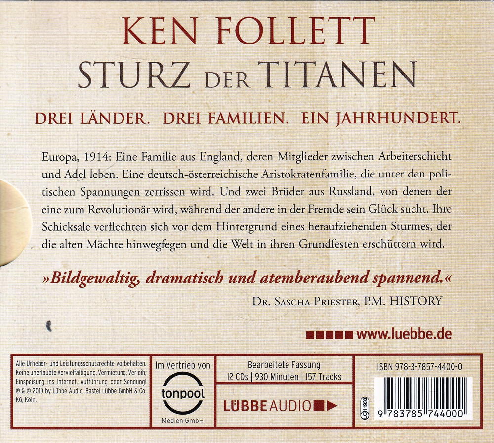 geraten und sich auf verschiedenen Seiten gegenüberstehen. Ken Folletts neue Trilogie spielt zwischen 1914 und 1989 und erzählt von drei Familien aus drei Ländern, deren Schicksale auf dramatische Weise miteinander verknüpft sind - und wird