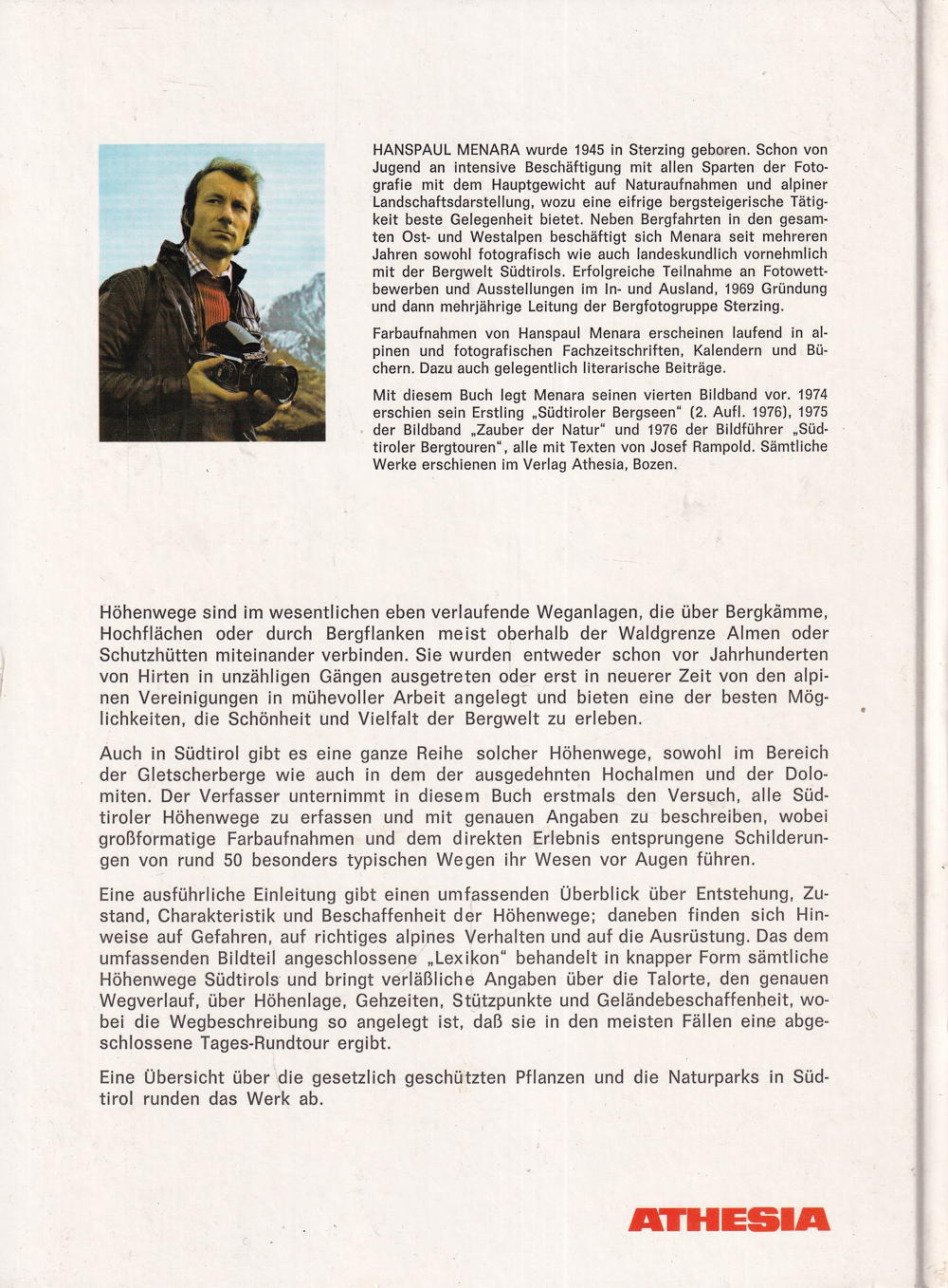 Eine ausführliche Einleitung gibt einen umfassenden Überblick über Entstehung, Zustand, Charakteristik und Beschaffenheit der Höhenwege; daneben finden sich Hinweise auf Gefahren, auf richtiges alpines Verhalten und auf die Ausrüstung. Das dem umfassenden Bildteil angeschlossene „Lexikon“behandelt in knapper Form sämtliche Höhenwege Südtirols und bringt verlässliche Angaben über die Talorte, den genauen Wegverlauf, über Höhenlage, Gehzeiten, Stützpunkte und Geländebeschaffenheit, wobei die Wegbeschreibung so angelegt ist, dass sie in den meisten Fällen eine abgeschlossene Tages-Rundtour ergibt.
