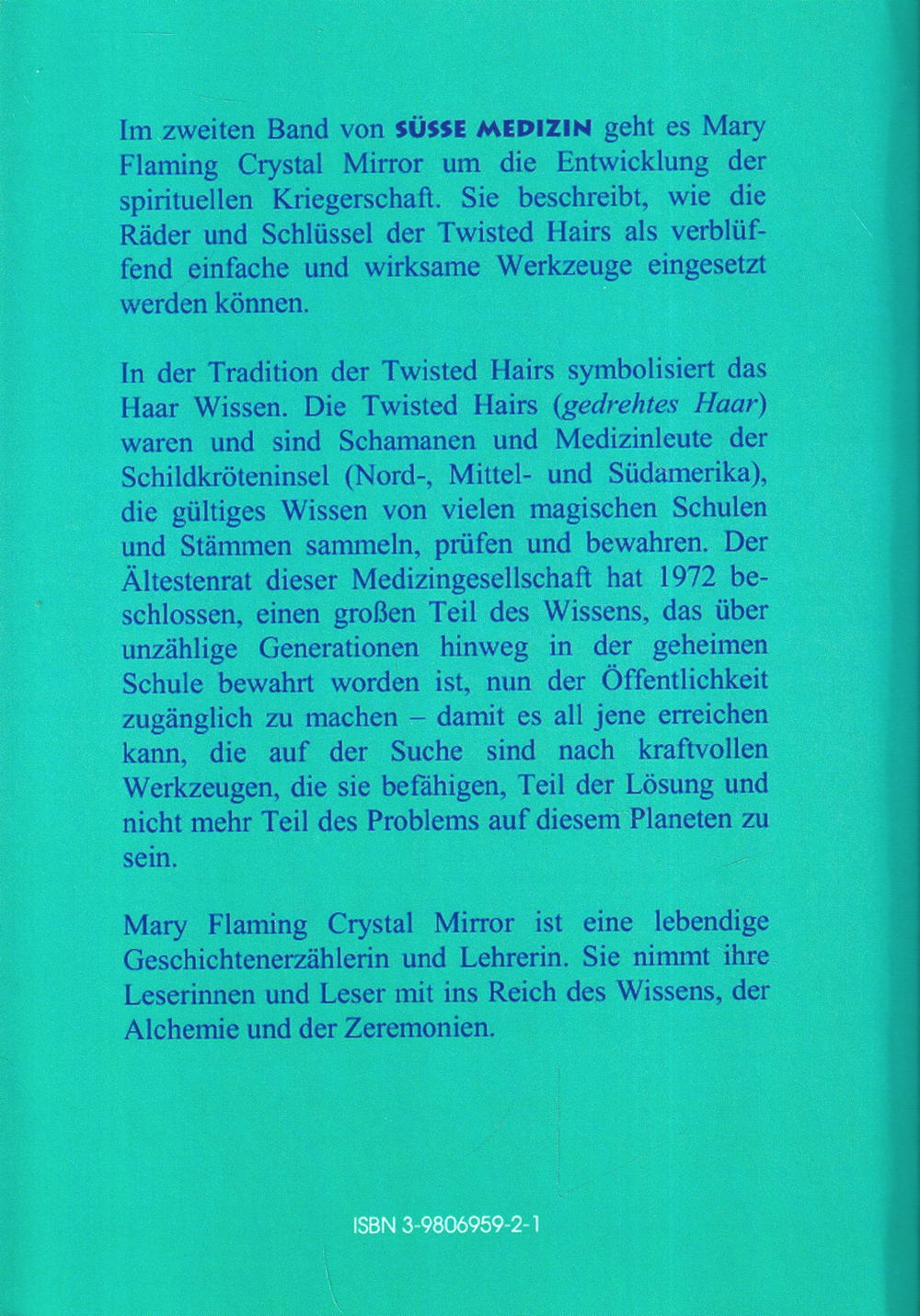 Im zweiten Band von süsSE MEDIZIN geht es Mary Flaming Crystal Mirror um die Entwicklung der spirituellen Kriegerschaft. Sie beschreibt, wie die Räder und Schlüssel der Twisted Hairs als verblüffend einfache und wirksame Werkzeuge eingesetzt werden können.
