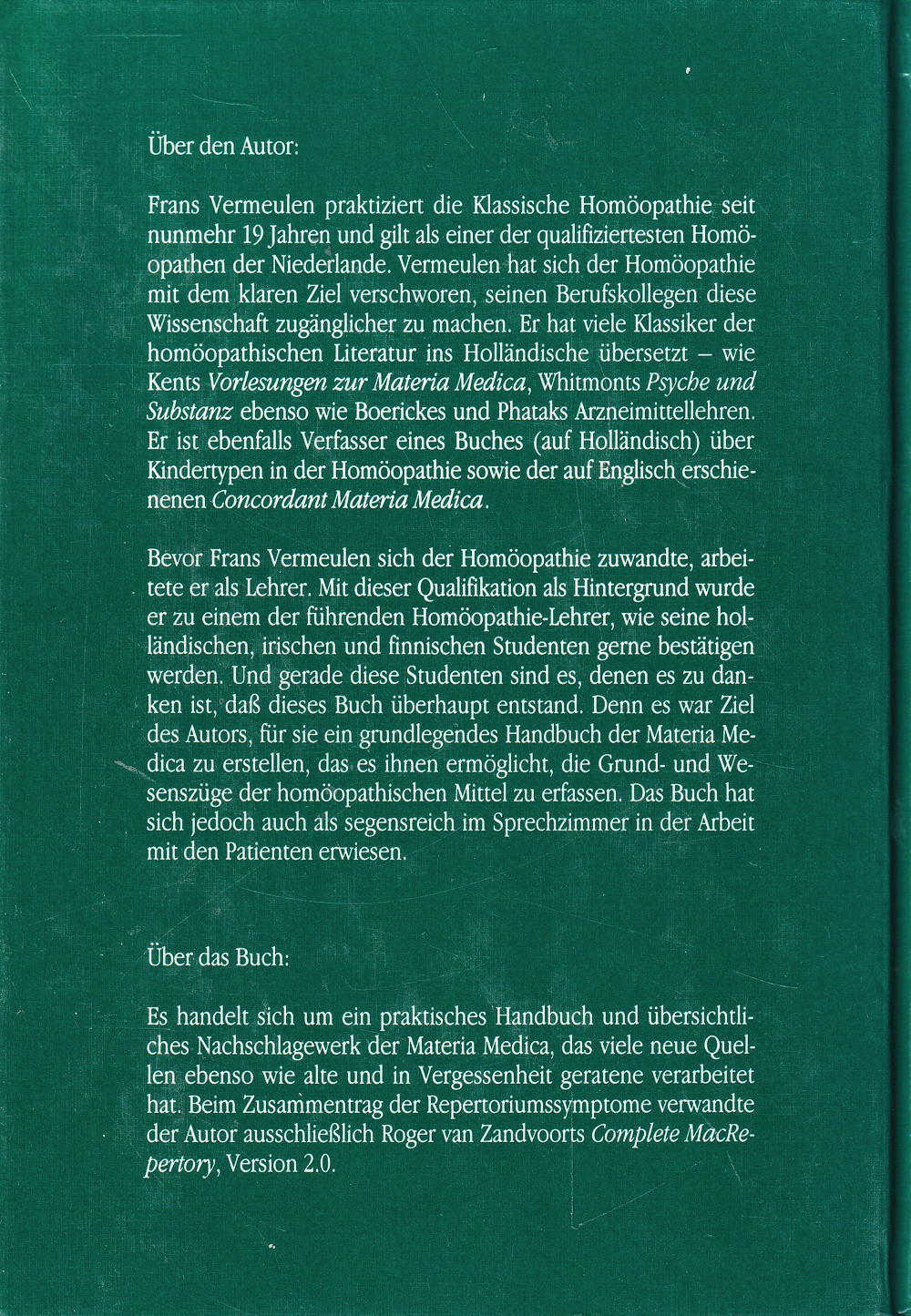 Bevor Frans Vermeulen sich der Homöopathie zuwandte, arbeitete er als Lehrer. Mit dieser Qualifikation als Hintergrund wurde er zu einem der führenden Homöopathie-Lehrer, wie seine holländischen, irischen und finnischen Studenten gerne bestätigen werden. Und gerade diese Studenten sind es, denen es zu danken ist, dass dieses Buch überhaupt entstand. Denn es war Ziel des Autors, für sie ein grundlegendes Handbuch der Materia Medica zu erstellen, das es ihnen ermöglicht, die Grund- und Wesenszüge der homöopathischen Mittel zu erfassen. Das Buch hat sich jedoch auch als segensreich im Sprechzimmer in der Arbeit mit den Patienten erwiesen.