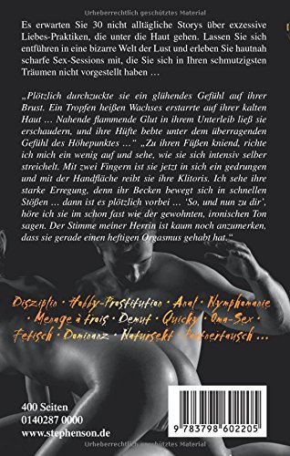 Es erwarten Sie 30 nicht alltägliche Storys über exzessive Liebes-Praktiken, die unter die Haut gehen. Lassen Sie sich entführen in eine bizarre Welt der Lust und erleben Sie hautnah scharfe Sex-Sessions mit, die Sie sich in Ihren schmutzigsten Träumen nicht vorgestellt haben.