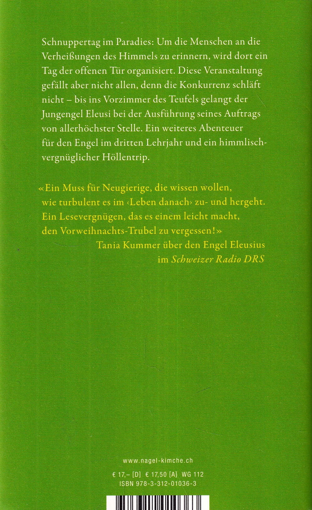 Schnuppertag im Paradies: Um die Menschen an die Verheissungen des Himmels zu erinnern, wird dort ein Tag der offenen Tür organisiert. Das kriegt die Hölle spitz und schickt Teufel Ronaldino als Spion. Wie die menschlichen Besucher ist allerdings auch er überrascht und begeistert vom Angebot. Er schliesst Freundschaft mit Engel Eleusi und bleibt im Himmel. Als Rache für die Abwerbung öffnet der Chefteufel seinerseits die Pforten der Unterwelt. Leider ist die höllische Veranstaltung ein Flop. Im Himmel hingegen gibt es ein grosses Fest für Besucher jeglicher Religion. Ein himmlisch-vergnügliches Abenteuer voller Humor, das uns nicht nur zu Weihnachten an das wirklich Wichtige erinnert.