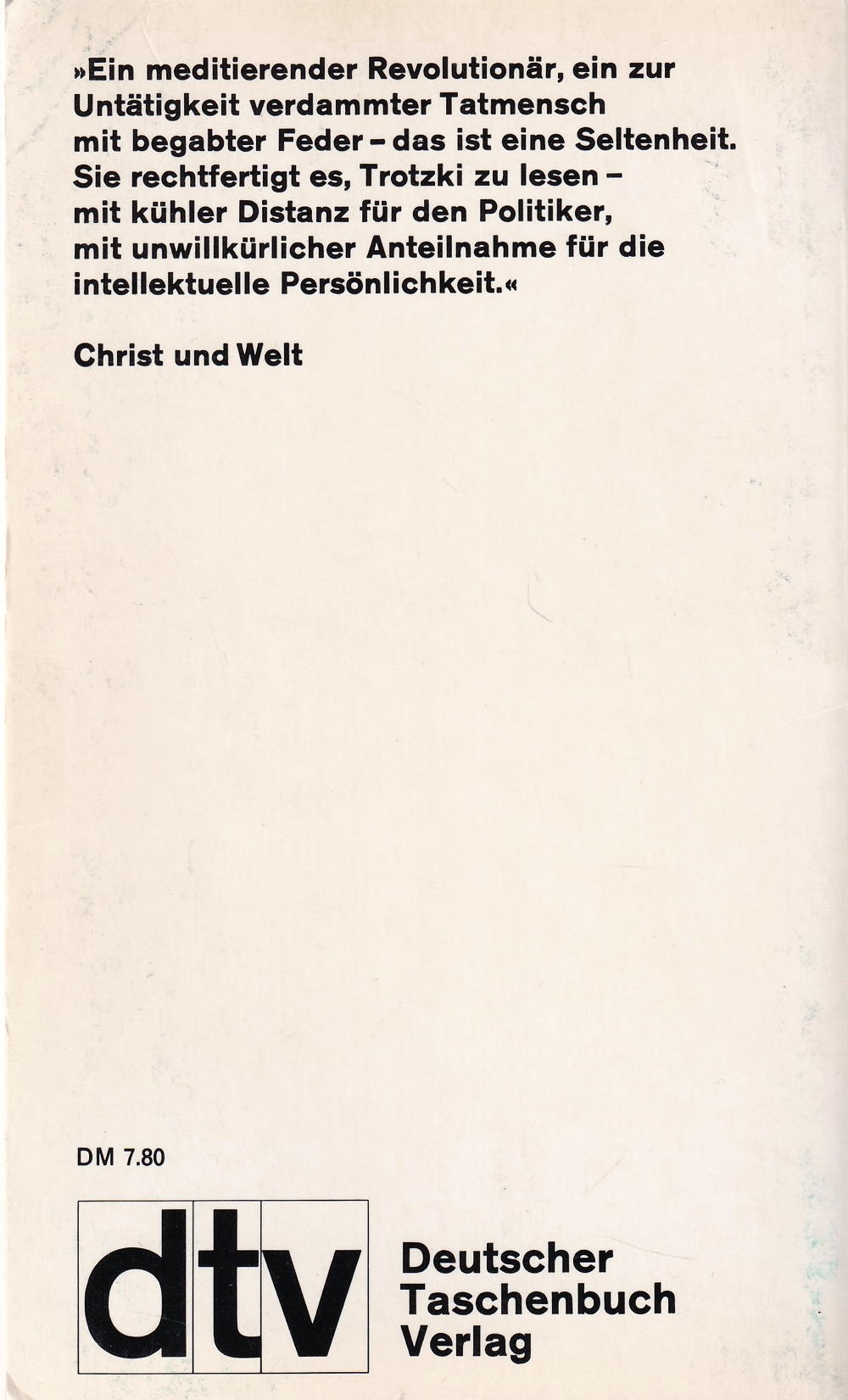 »Ein meditierender Revolutionär, ein zur Untätigkeit verdammter Tatmensch mit begabter Feder - das ist eine Seltenheit. Sie rechtfertigt es, Trotzki zu lesen mit kühler Distanz für den Politiker, mit unwillkürlicher Anteilnahme für die intellektuelle Persönlichkeit. «
