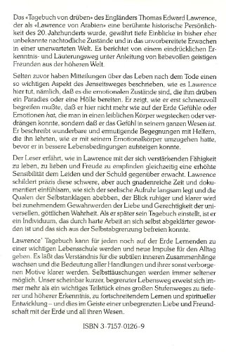 Das «Tagebuch von drüben» des Engländers Thomas Edward Lawrence, der als «Lawrence von Arabien» eine berühmte historische Persönlichkeit des 20. Jahrhunderts wurde, gewährt tiefe Einblicke in bisher eher unbekannte nachtodliche Zustände und in das unvorbereitete Erwachen in einer unerwarteten Welt. Es berichtet von einem eindrücklichen Erkenntnis- und Läuterungsweg unter Anleitung von liebevollen geistigen Freunden aus der höheren Welt.