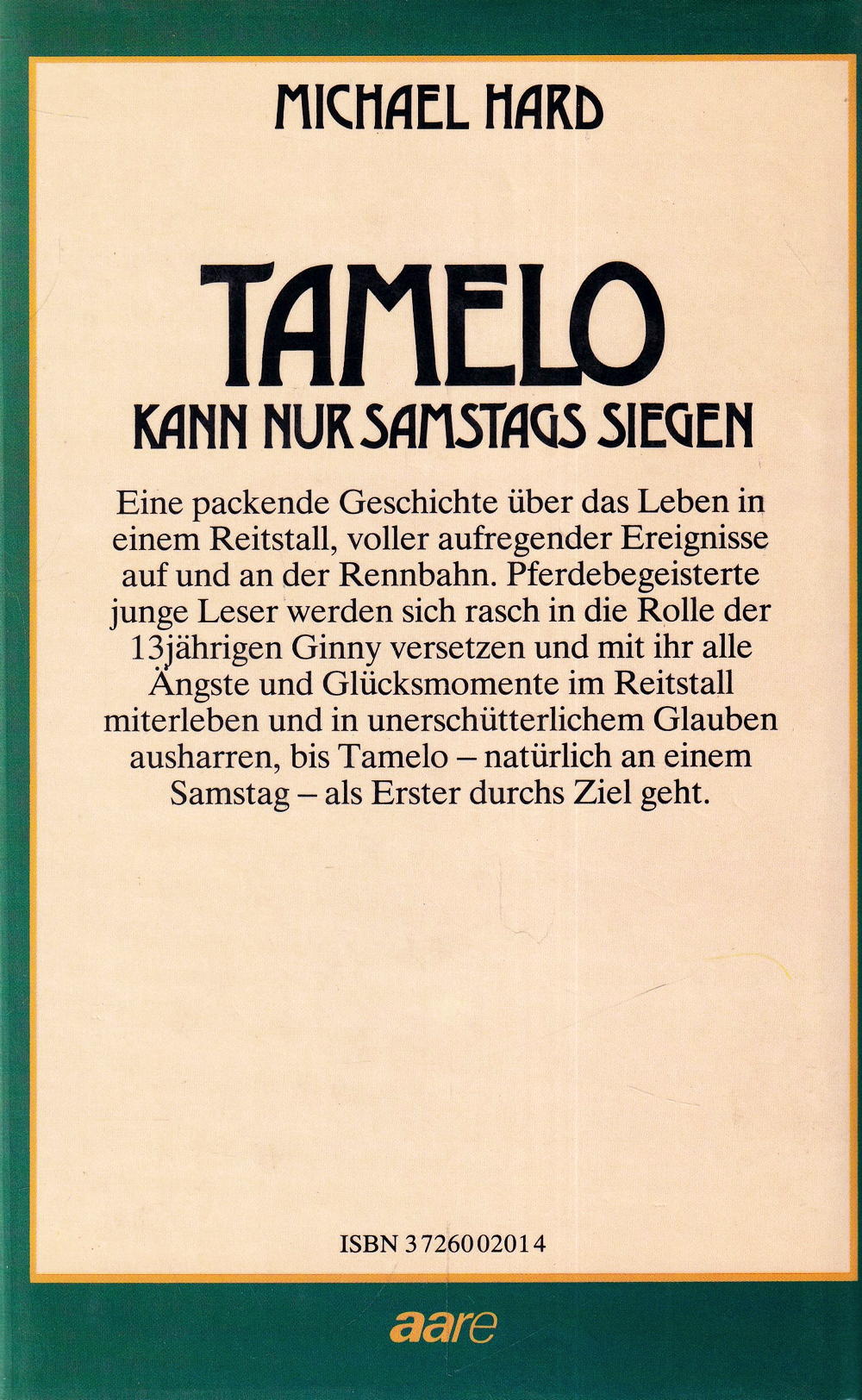 Eine packende Geschichte über das Leben in einem Reitstall, voller aufregender Ereignisse auf und an der Rennbahn. Pferdebegeisterte junge Leser werden sich rasch in die Rolle der 13 jährigen Ginny versetzen und mit ihr alle Ängste und Glücksmomente im Reitstall miterleben und in unerschütterlichem Glauben ausharren, bis Tamelo – natürlich an einem Samstag - als Erster durchs Ziel geht.