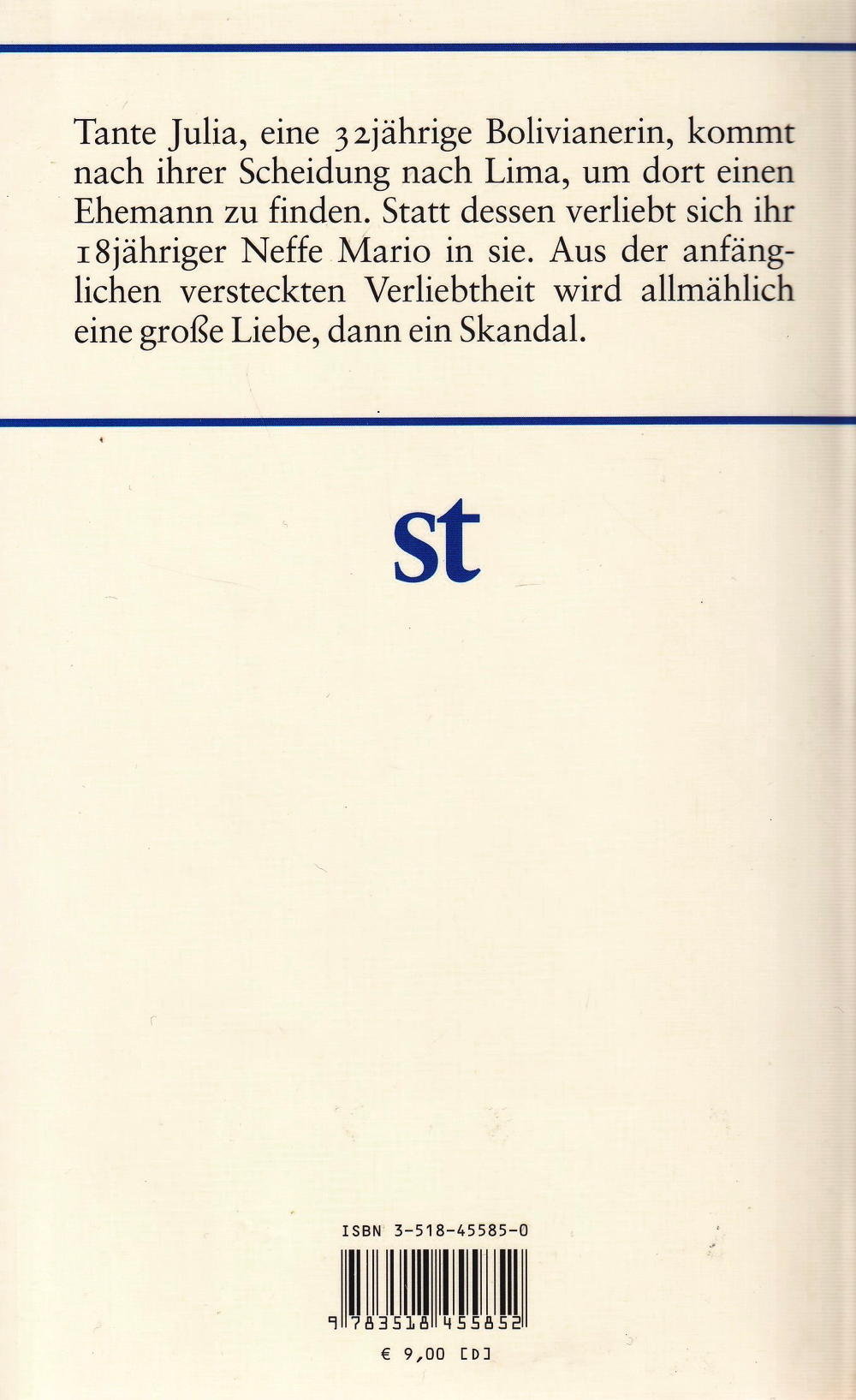 Tante Julia, eine 32jährige Bolivianerin, kommt nach ihrer Scheidung nach Lima, um dort einen Ehemann zu finden. Statt dessen verliebt sich ihr 18jähriger Neffe Mario in sie. Aus der anfänglichen versteckten Verliebtheit wird allmählich eine grosse Liebe, dann ein Skandal.