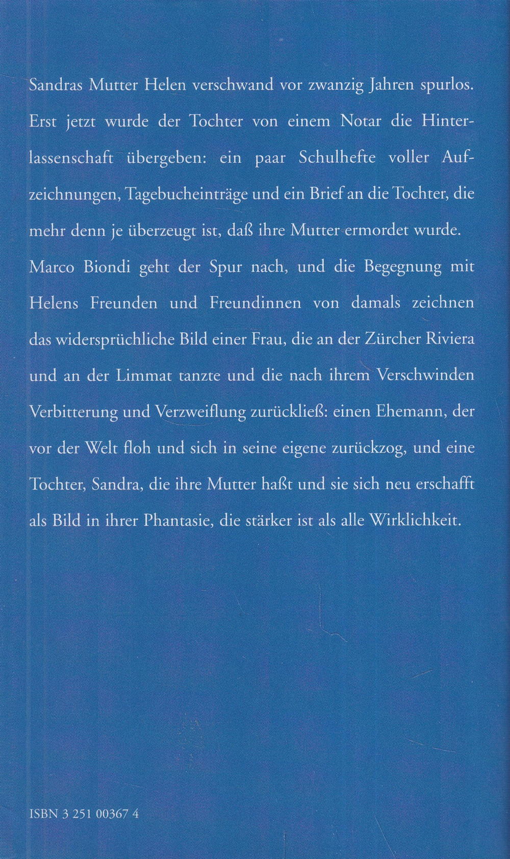 Marco Biondi geht der Spur nach, und die Begegnung mit Helens Freunden und Freundinnen von damals zeichnen das widersprüchliche Bild einer Frau, die an der Zürcher Riviera und an der Limmat tanzte und die nach ihrem Verschwinden Verbitterung und Verzweiflung zurückliess: einen Ehemann, der vor der Welt floh und sich in seine eigene zurückzog, und eine Tochter, Sandra, die ihre Mutter hasst und sie sich neu erschafft als Bild in ihrer Phantasie, die stärker ist als alle Wirklichkeit.