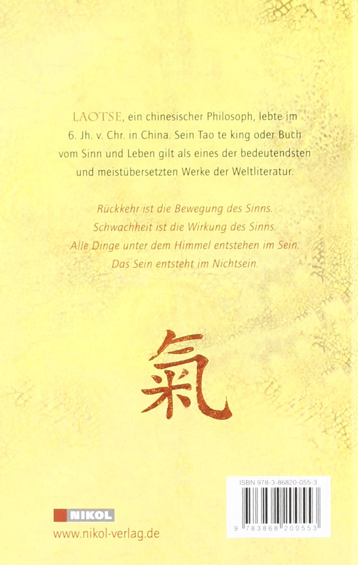 'Wen der Himmel retten will, den schützt er durch die Liebe.' Das vor rund dreitausend Jahren entstandene 'Tao te king' des legendären Laotse ist gerade in seiner aphoristischen Kürze ein unerschöpfliches Weisheitenbuch. Seine zentrale Figur, der Berufene, lebt im Einklang mit dem Tao, dem 'Sinn' des Universums, indem er „nicht handelt“ und sich vom weltlichen Wirken fernhält. Das Buch vermag über den Taoismus hinaus auch noch heutige westliche Leser unmittelbar anzusprechen. Die Übersetzung stammt von Richard Wilhelm (1873-1930), einem der wichtigsten Vermittler chinesischen Denkens im Westen. Die Übersetzungen des Professors für Sinologie sind einzigartig.