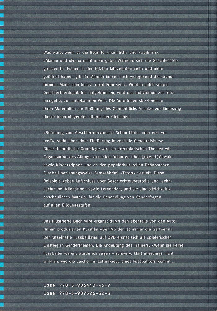 Diese theoretische Grundlage wird an exemplarischen Themen wie Organisation des Alltags, aktuellen Debatten über (Jugend-) Gewalt sowie Kinderkrippen und an den populärkulturellen Phänomenen Fussball beziehungsweise Fernsehkrimi «Tatort» vertieft. Diese Beispiele geben Aufschluss über Geschlechtervorurteile und -sehnsüchte bei Klientlnnen sowie Lernenden, und sie sind gleichzeitig anschauliches Material für die Behandlung von Genderfragen auf allen Bildungsstufen.
