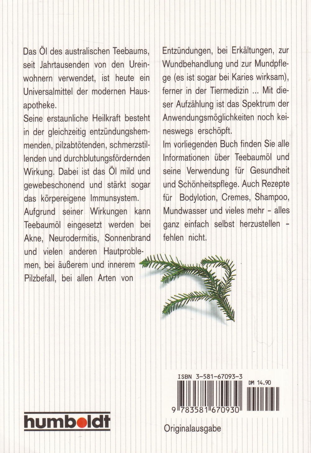 Im vorliegenden Buch finden Sie alle Informationen über Teebaumöl und seine Verwendung für Gesundheit und Schönheitspflege. Auch Rezepte für Bodylotion, Cremes, Shampoo, Mundwasser und vieles mehr - alles ganz einfach selbst herzustellen fehlen nicht.