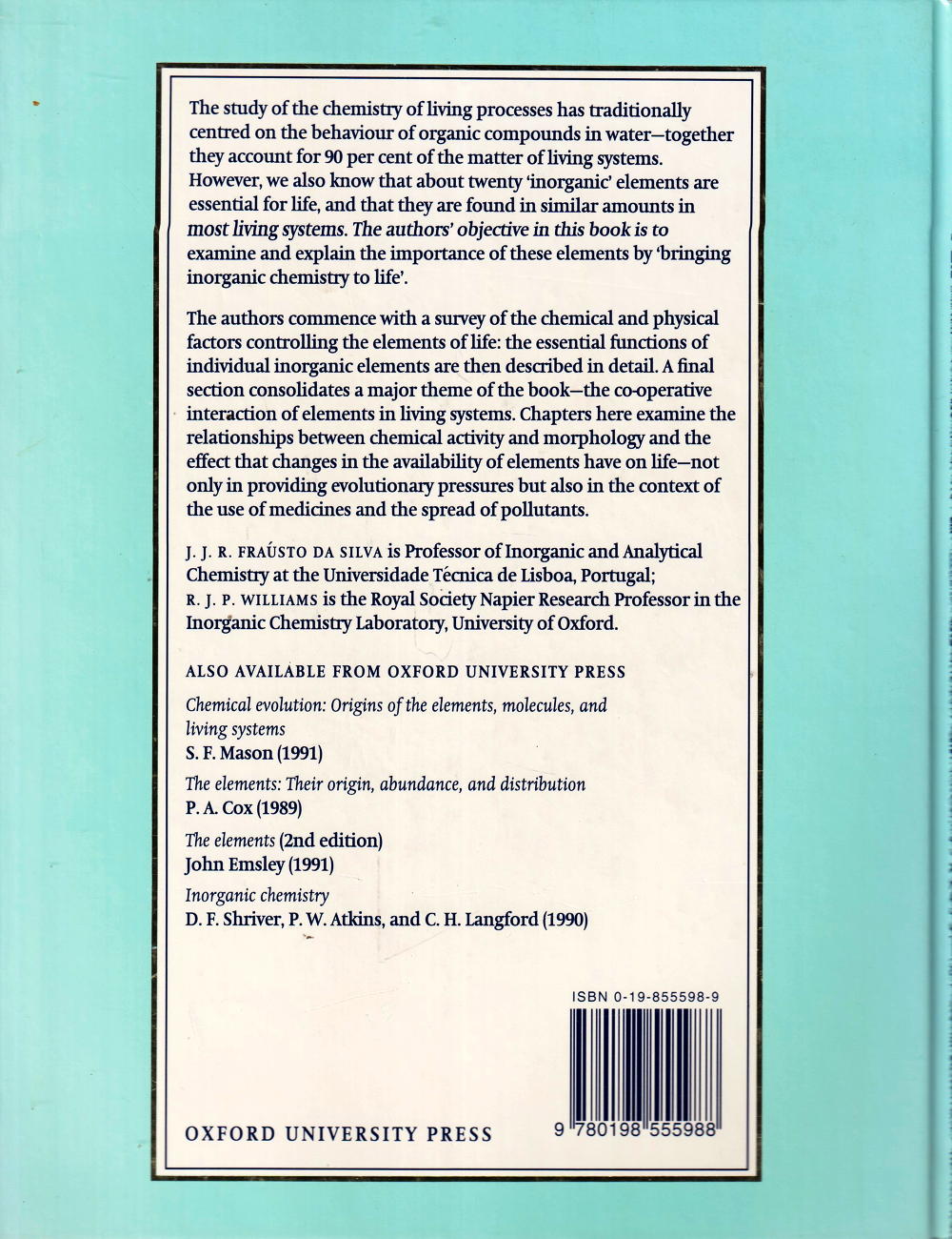 The study of the chemistry of living processes has traditionally centered on the behavior of organic compounds in water; together they account for 99 per-cent of the matter in living systems. However, we also know that about 20 "inorganic" elements are also essential for life, and that they are found in similar amounts in most living systems. This book's objective is to examine and explain the importance of these elements. The authors begin with a survey of the chemical and physical factors controlling the elements of life. The essential functions of individual inorganic elements are then detailed. A final section consolidates a major theme of the book -- the cooperative interaction of elements in living systems. These chapters discuss the relationships between chemical activity and morphology and the effect that changes in the availability of elements have on life -- not only in providing evolutionary pressures but also in the context of the use of medicines and the spread of pollutants. This major graduate-level chemistry text provides a completely new way of looking at the chemistry of living processes. It is essential reading for all scientists interested in bioinorganic chemistry, including biologists, biochemists, chemists and physicists.