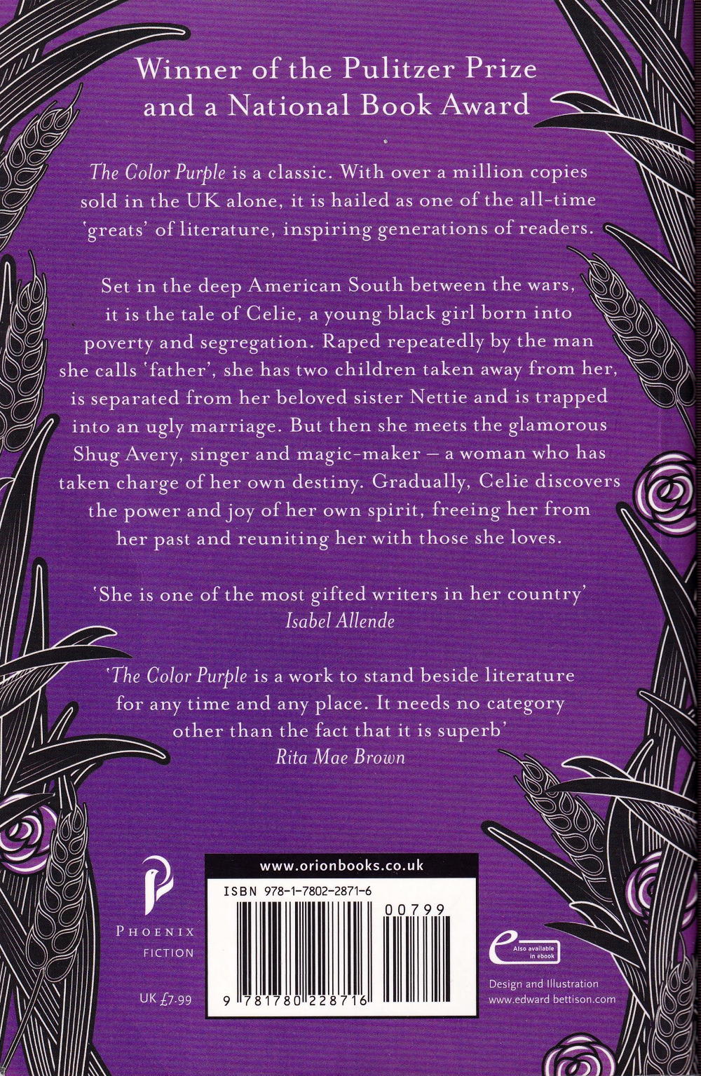 Set in the deep American South between the wars, The Color Purple is the classic tale of Celie, a young black girl born into poverty and segregation. Raped repeatedly by the man she calls 'father', she has two children taken away from her, is separated from her beloved sister Nettie and is trapped into an ugly marriage. But then she meets the glamorous Shug Avery, singer and magic-maker - a woman who has taken charge of her own destiny. Gradually Celie discovers the power and joy of her own spirit, freeing her from her past and reuniting her with those she loves.
